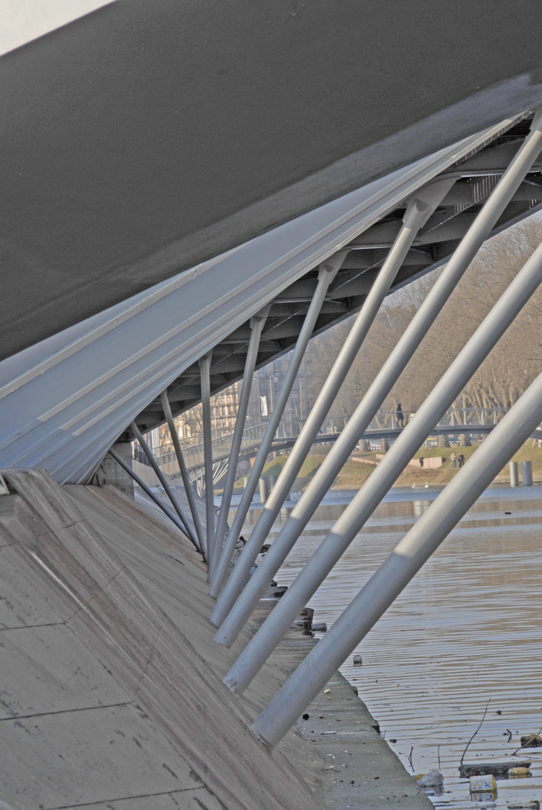 Local oak wood as deck covering, the transparent railing made of a stainless steel cable net and the integrated lighting of the bridge create the specific atmosphere on the bridge. Structure is a main part of the form. It is clearly expressed, details are carefully designed and tell the way forces are led to the banks.