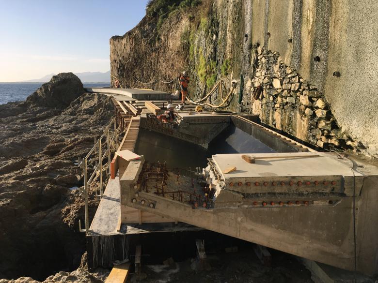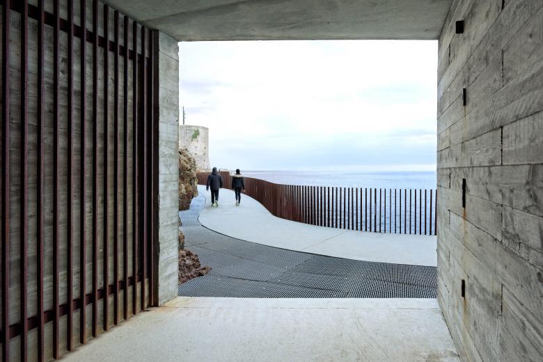 Plus qu'un chemin, une destination avec de nouvelles perspectives sur le large, suspendue entre mer et ciel, Aldilonda devient un événement spectaculaire. Un chemin doucement courbé contraste avec la forteresse massive et le rocher sur lequel le bastion est fondé. Le chemin se blottit contre le rocher, s'appuie contre lui, le traverse, s'élargit et offre des lieux où s'attarder. Sensiblement, la construction se fond dans le rocher, le riche espace naturel de la côte est soigneusement parcouru. En même temps, la bande rouge de la balustrade en acier Corten offre un sentiment de sécurité élevé au-dessus du ressac. Les garde-corps offrent une transparence maximale, le rocher ferrugineux s'harmonise avec le rouge rouillé de la balustrade.