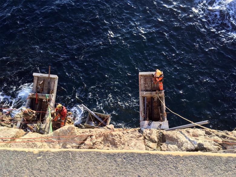 La mer peut être vécue à travers la zone couverte d'une grille transparente. Le balcon est exposé au ressac ; lorsque les vagues sont hautes, l'eau passe à travers la grille en acier inoxydable du rocher, ce qui réduit la force massive de l'eau. Des tests hydrauliques dans un bassin de La Seyne sur Mer ont été nécessaires pour déterminer la force de l'impact des vagues à 14 tonnes par mètre carré.