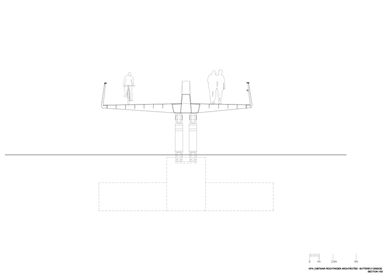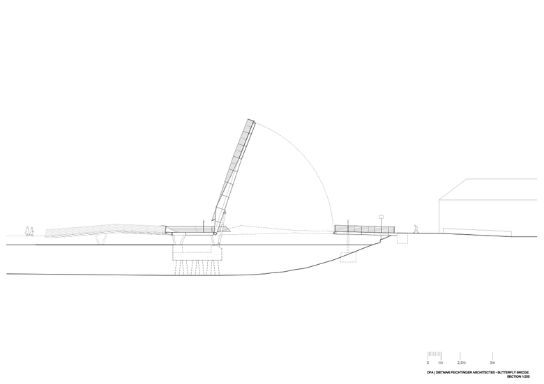 La situation très spécifique exigence une forme originale pour cette passerelle: Trois tabliers relient les différentes rives. Fixé sur une plateforme commune, un tablier est fixe les deux autres ouvrants pour faire passer les voiliers. Lorsque les deux battants sont ouverts simultanément, ils forment un papillon, une belle figure, qui est spectaculaire par ses dimensions.