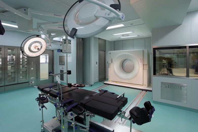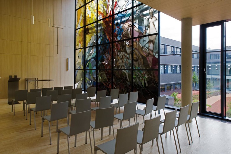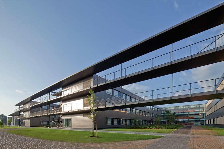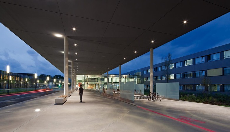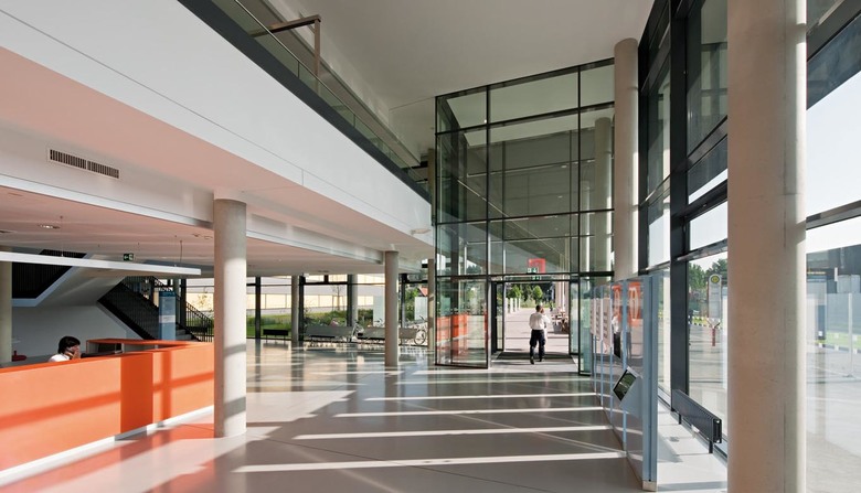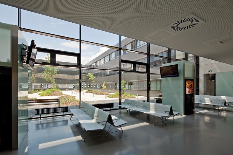 The subdivision of the complex into a building for the health-care center and one for the surgical-medical center seemed obvious, the articulation of the latter was a genuinely creative achievement. The guiding idea here was embedding the building in an extensive park and creating a kind of “hotel character” instead of the traditional, but oppressive hospital character. The most striking characteristics of the new complex are without doubt the “fingers” housing the patients wards which extend northwards from the spine of the surgery wing into the park. The overall structure, which is both compact and open, is rooted in a strong double slab with an east-west orientation: here the emergency department, the operating theatres and the doctors’ offices are located in the northern of the two parallel slabs. Between them there are a number of courtyards, attractively planted and even creatively designed using glass blocks. The wards and intensive stations which are housed in the four north-south wings can be conveniently reached from these central areas. The intensive stations are open spaces with glass partitions that take up almost the entire depth of the wing, a corridor running along the east façade allows one to walk past them.