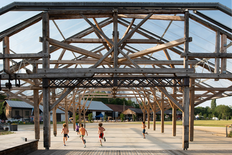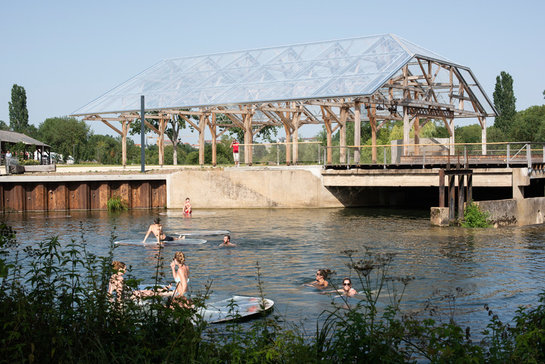 La passerelle débouche sur l’esplanade de la scierie surplombant le Clain. Le bâtiment scierie, mis en sécurité, conserve uniquement sa structure en bois pour devenir une véritable halle à ciel ouvert.