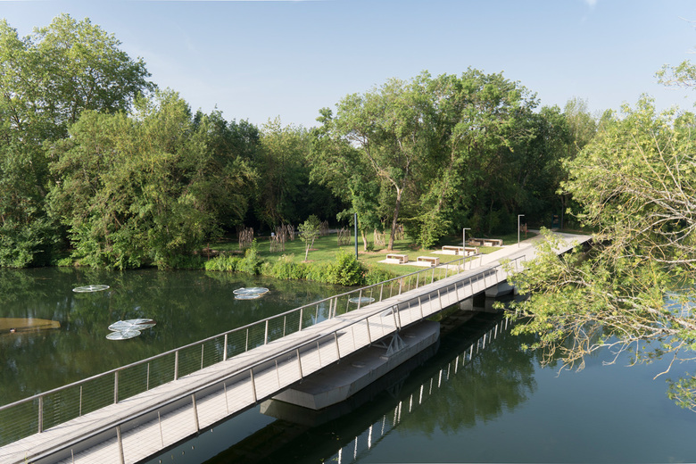 Elle est construite sur une structure flottante et intègre des bancs qui la transforment en un nouveau belvédère qui rapproche les utilisateurs de l’eau du Clain. Le parcours sur le fleuve prend forme d’un ricochet, rasant l’eau de justesse pour traverser d’une île à l’autre. L’utilisation d’appuis flottants permet une d’assurer légèreté et transparence sans modifier le lit du fleuve. Pendant les crues la structure flotte.