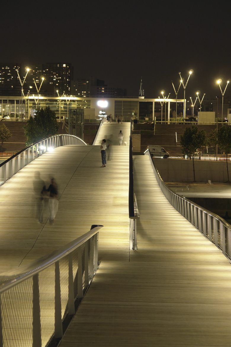 It is one and many, formed by waves giving it a syncopated rhythm. It crosses over the riverside roadways to either side – on the right bank, a chaotic expanse and, on the left bank, a more organised avenue running below the steps leading up to the National Library. It rests on the river banks, relaxed and open on one side, restricted on the other, before its symmetrical launch, freed from its asymmetrical departure points. Over its 194 metres, an arch and a beam cross in the air above the water, each linking the two heights of the two banks: at the top, the National Library esplanade and garden terrace with lower down, the two quaysides. Ramps and staircases lead to the river banks.