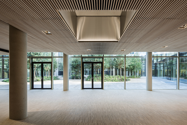 The project is based on a strong relationship between building and garden. The garden develops on three levels and offers different atmospheres. The three outdoor areas are inspired by natural environment, yet they are part of a precious landscaping design concept that offers refreshing green islands. The garden in the courtyard serves as a background for the visual continuity with the channel and guarantees a visual depth. The building is accessible through three halls. The forecourts of these halls are the only withdrawal of the project in terms of orientation; they are surrounded by a fence and closed outside office hours.