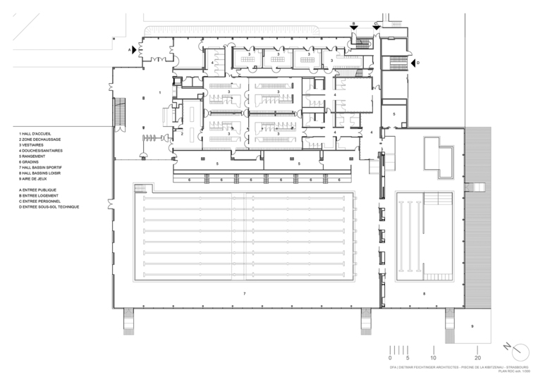 La restructuration permet de trouver un fonctionnement clair, lisible. On retrouve la marche en avant entre l’accueil, les vestiaires mixtes, les douches et les bassins en accord avec les attentes d’hygiène d’aujourd’hui. Ceci devient possible en déplaçant l’entrée à l’angle nord-ouest et en fermant le patio au rez-de-chaussée par une dalle. Les espaces des vestiaires collectifs sont adjacents aux espaces du grand public et se situent dans la continuité spatiale.