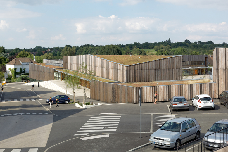 L’angle de la rue de Vienne et la rue de Paris est stratégique par rapport au centre-ville. La volumétrie de la bibliothèque est visible de loin et annonce l’équipement, transformant ainsi le pôle en élément majeur de la composition urbaine. La bibliothèque longe l’école maternelle à l’ouest et se prolonge jusqu’au volume du gymnase situé au nord du terrain. Bibliothèque et gymnase soulignent leur rôle extrascolaire en formant une « maison de quartier ».