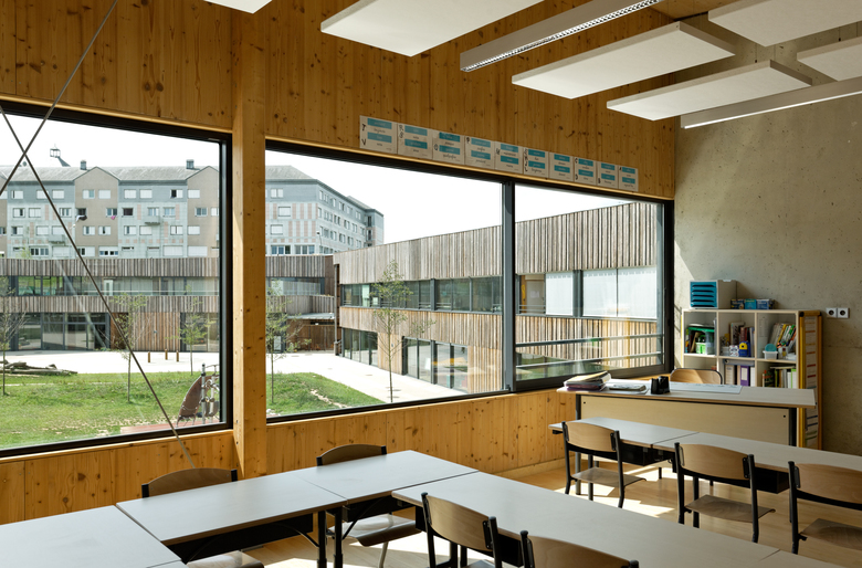 Les écoles élémentaire et maternelle donnent sur une grande cour offrant des espaces différenciés à l’échelle des enfants. Toutes les classes sont tournées vers la cour et bénéficient d’un ensoleillement tout au long de la journée.