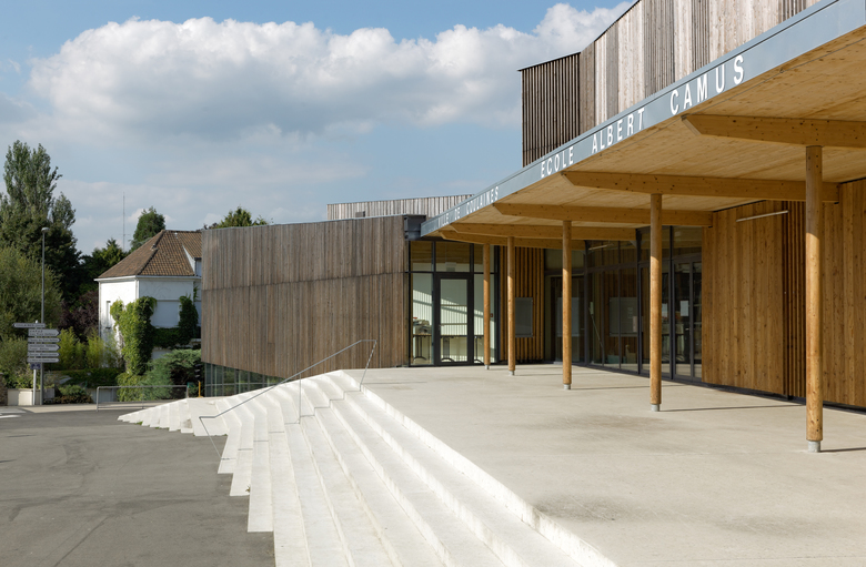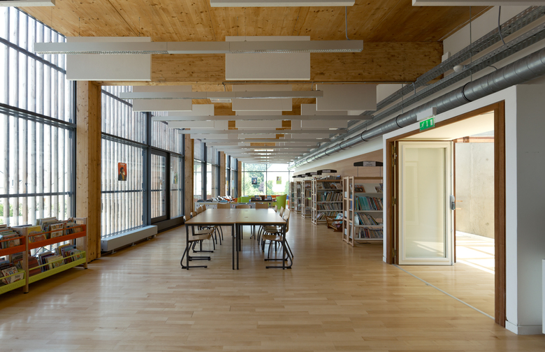 Un accès indépendant de l’entrée principale de l’école permet l’usage du gymnase et de la bibliothèque en dehors des heures de l’école. La bibliothèque située à l’angle de la rue de Paris et la rue de Vienne est orientée vers le centre ville.