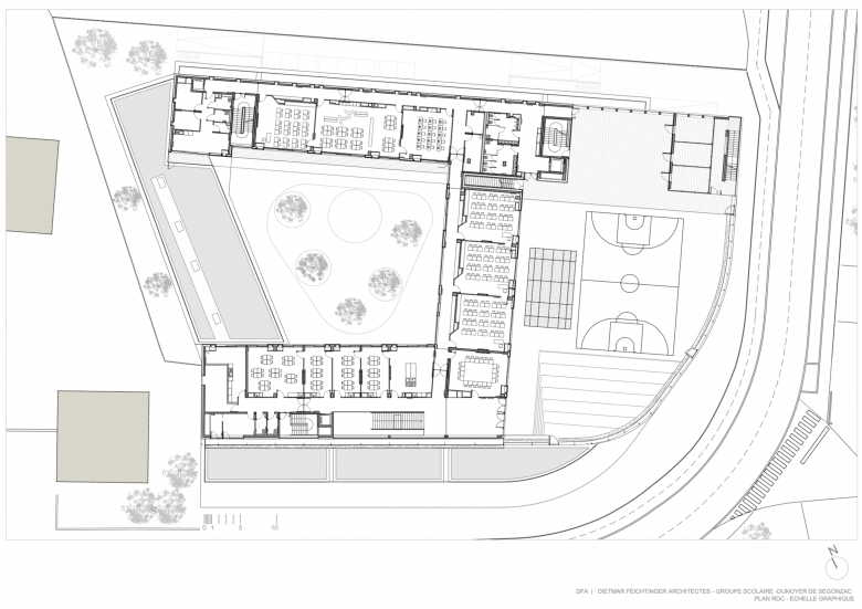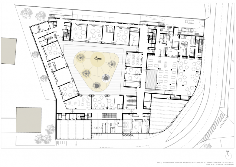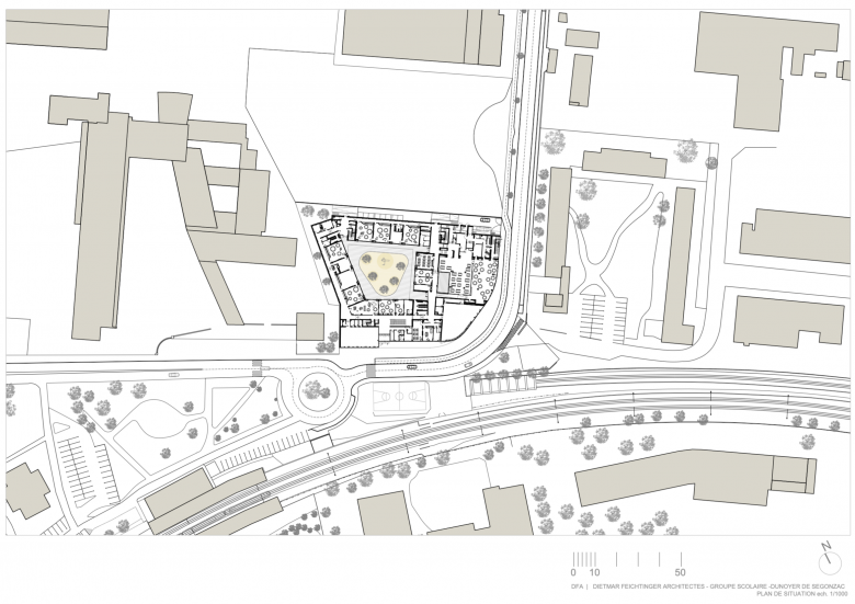 Les différentes trajectoires du soleil selon la saison ont été simulées. Les ailes du bâtiment sont décalées en hauteur : trois étages au nord-est, deux au nord-ouest et un étage donnant sur la voie en courbe du sud-ouest au sud-est. Le soleil entre de manière optimale dans les cours et les salles de classe, la consommation d'énergie reste faible. L'école se compose en quatre ailes qui entourent une grande cour trapézoïdale. Une cour arborée et une grande toit-terrasse pour les classes aux étages forment une centralité.