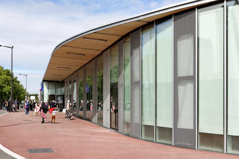 Cette séquence donne sur la rue avec une façade vitrée courbe, en partie translucide et vêtu de métal déployé à l’endroit des ouvrants.