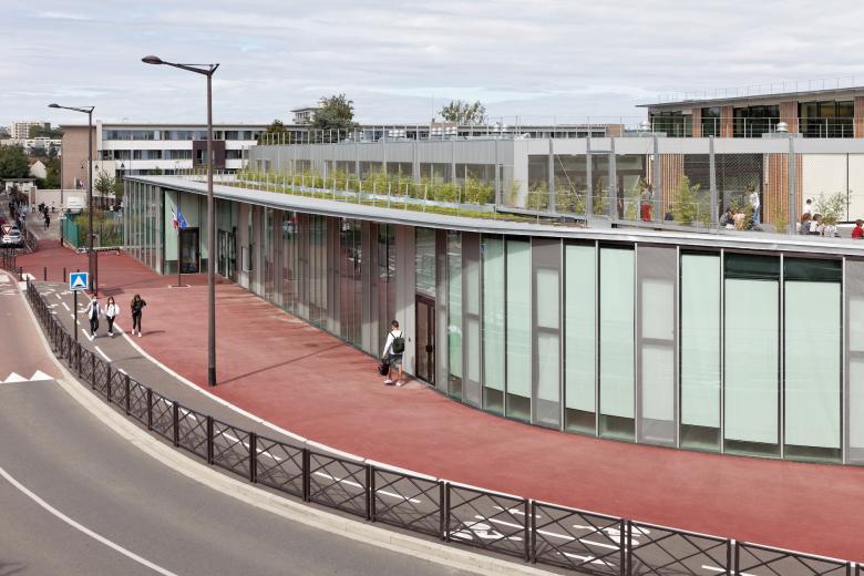 L'étage supérieur est organisé de manière similaire : des salles de classes sont orientées vers la grande terrasse dont les bords arrondis font référence à la courbe de la rue. Son revêtement est constitué d’une surface en béton drainant et une partie en caillebotis couvrant le patio du restaurant. Des gradins au sud qui suivent l’inclinaison de la toiture de la salle polyvalente au rez de chaussée sont en bois.