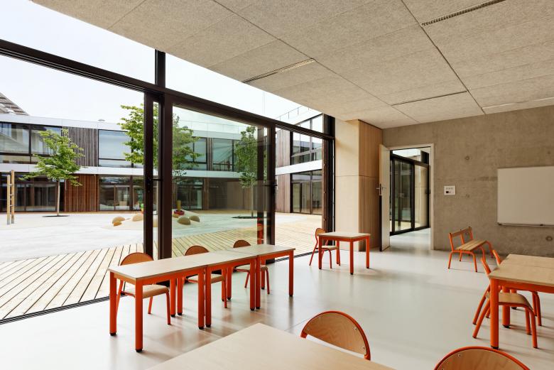 Toutes les classes des maternelles sont situées au rez-de-chaussée. Des façades vitrées toute hauteur intègrent des grandes ouvertures coulissantes. Elles s’ouvrent sur la cour qui est conçue comme un paysage artificiel avec de douces collines en sol souple, d'arbres et d'aires de jeux. Les enfants peuvent sortir directement de leurs classes.