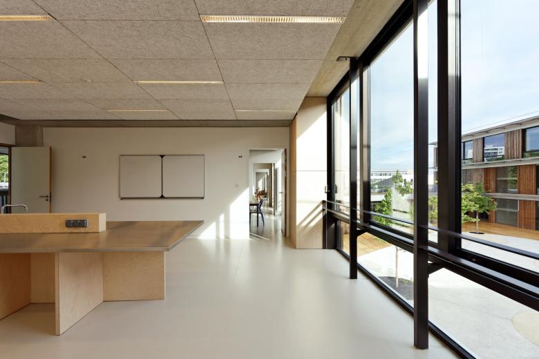La qualité de l'air joue un rôle majeur dans le bien-être et la capacité de concentration des enfants. Un panneau en bois du sol au plafond interrompt la façade vitrée des classes. Derrière ce panneau des ventelles motorisées s’ouvrent automatiquement en cas de besoin d’oxygène. Un radiateur réchauffe l'air entrant en hiver pour éviter un courant froid. Si le taux de CO2 dans l'air ambiant augmente de trop, de l'air frais est ainsi fourni. L’extraction se fait par des gaines verticales et des extracteurs situés en toiture – un par classe.