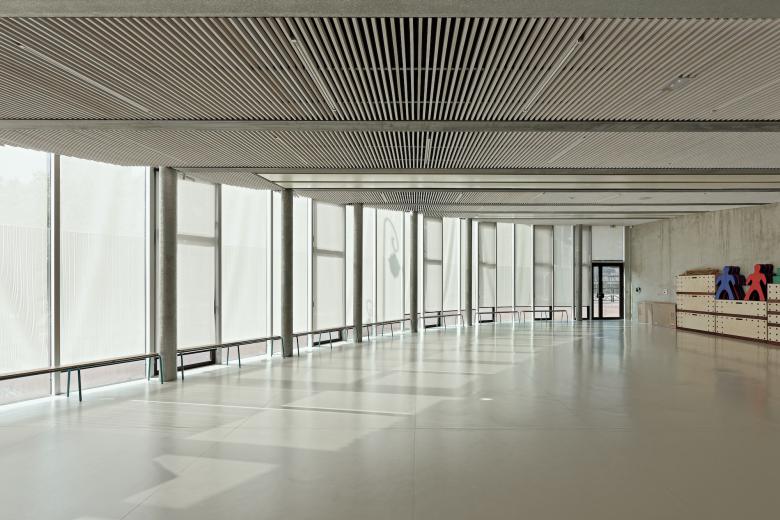 La salle polyvalente du rez-de-chaussée est placée sur la courbe au sud-est. C’est un espace de jeux, de sport et d'exercice pour les enfants, mais aussi pour des événements extrascolaires. Elle forme la jonction entre le restaurant scolaire côté rue et l'entrée dans l'aile sud-ouest de l'école.