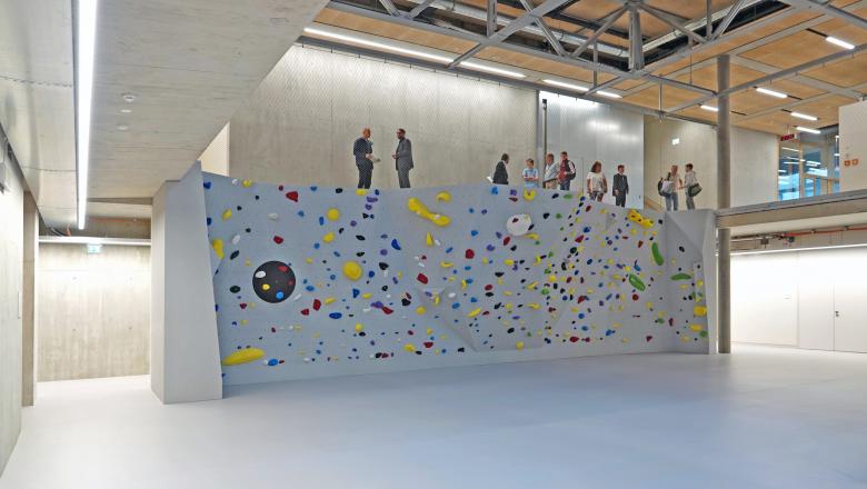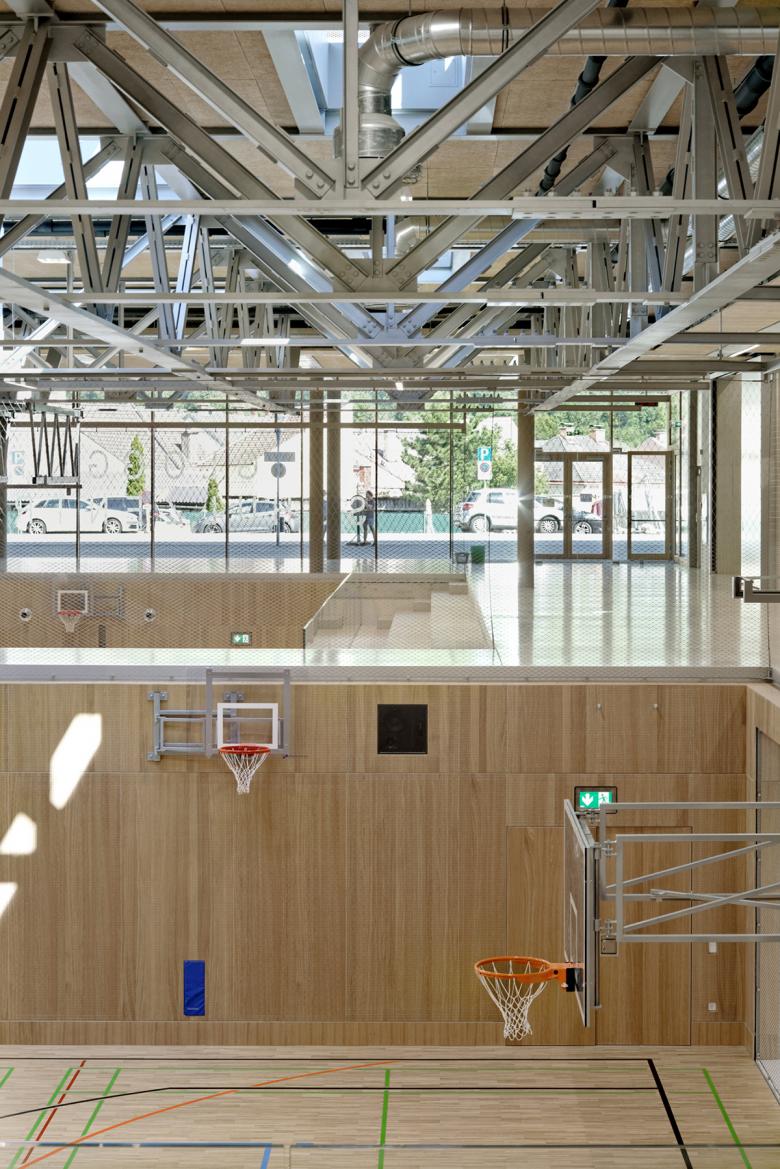 As soon as one enters the foyer, one notices the essential element of this complex design: three sports areas, as a generous 7.88-metre high, see-through volume, form the spatial and ideal center of the square floor plan. Skylight domes illuminate this open, central area with natural light, which is supported by a filigree, optimized, three-dimensional steel framework and spans 30 meters. The architecture of this spatial volume implements the ambitious, educational program of the new open and integrative school in three dimensions. The focus of the new secondary school is on sports, and in general, exercise is important for all children. It promotes concentration, coordination and learning ability in a holistic way. The rooms adapted to the different activities - the common gymnasium, the gymnastics hall, the climbing wall - stretch over all levels, from its floor level in the basement to its roof terrace on the first floor. Their clearance forms the luminous center of the foyer: glass balustrades and fine tensioned cable mesh as safety and ball throwing nets generate a visually continuous open space. The sports areas are bordered on two sides by glazed seating tribunes. They turn the gymnasium, gymnastics hall and climbing wall into a scene.