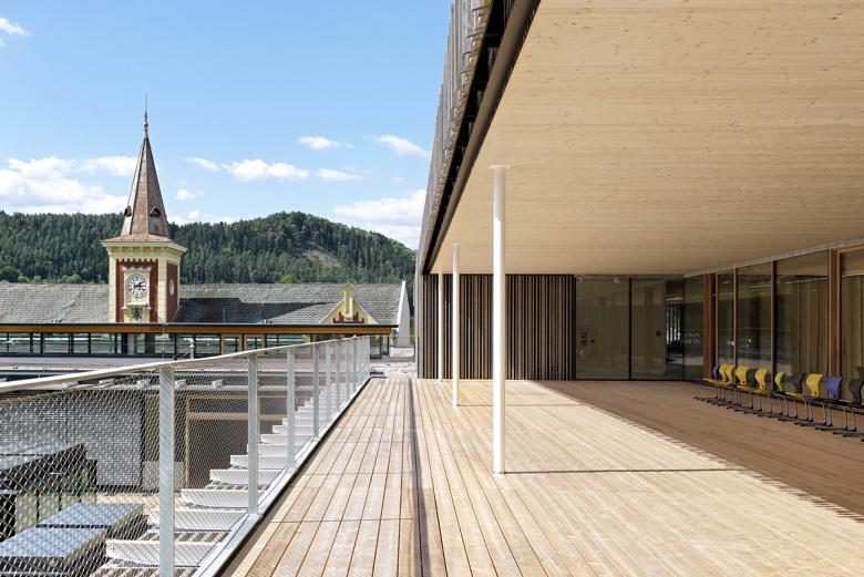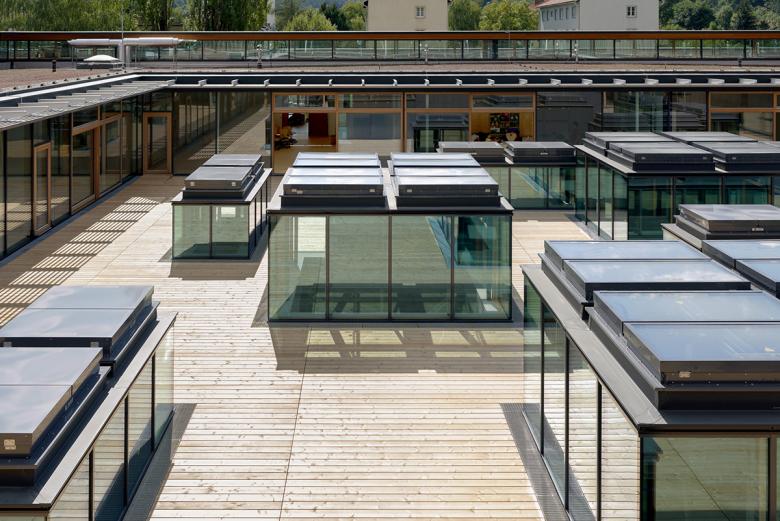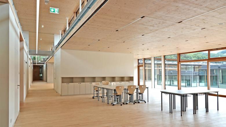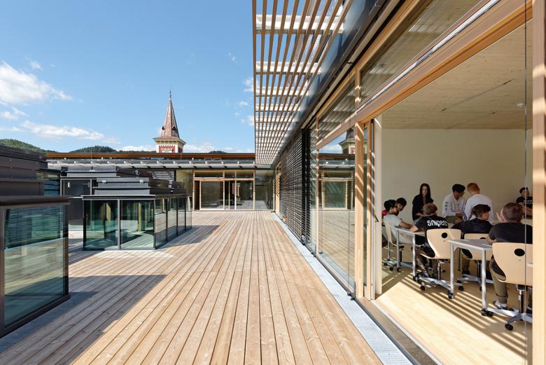 All classrooms for all three school types are located on a common level on the first floor. Their center is formed by the wooden roof terrace with prism-shaped skylight lanterns on the spacious volume of the sports areas. They provide a differentiated division of this large, common open space for all, which can also be used as an "open-air classroom". Around this open courtyard, new school is organized according to the cluster concept: openable classrooms are grouped around a so-called "marketplace", which merges into the open circulations. In this way, lessons can take place in an open space situation involving several classes. In that way, all areas become the setting for joint learning and living together across school types.