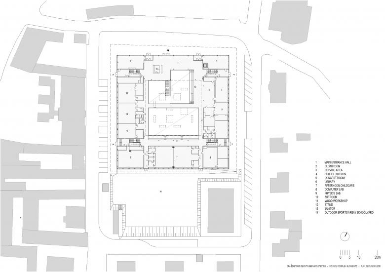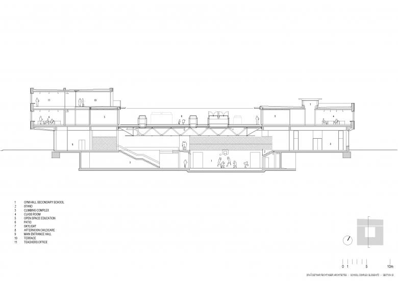 The school center is very clearly structured. The ground floor is the public area: at the entrance are two cloakrooms located, all classes for practical teaching and special lessons are arranged in a ring around the clear space for sports and exercise. They are easily accessible for external use via the foyer or the side entrances. The vertical circulation - stairs and lift - are placed in the edges of the building. The stairs designed as emergency exits are normally open. In case of a fire the access doors close automatically.