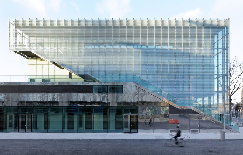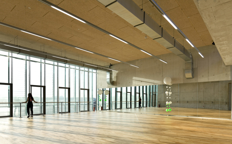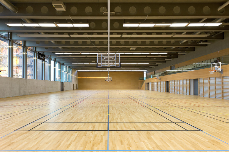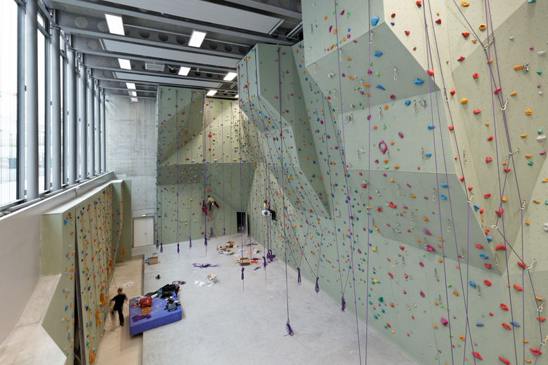 Les parties opaques suivent la structuration horizontale du bâtiment. Les murs opaques du gymnase et du squash se distinguent par une vêture en tôle inox poli et plissée. Le matériau rend les façades lumineuses et reflète les couleurs de la ville.