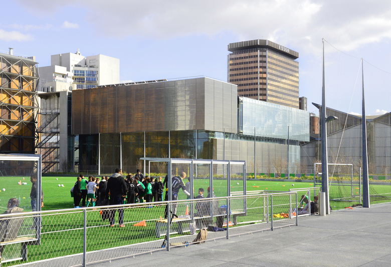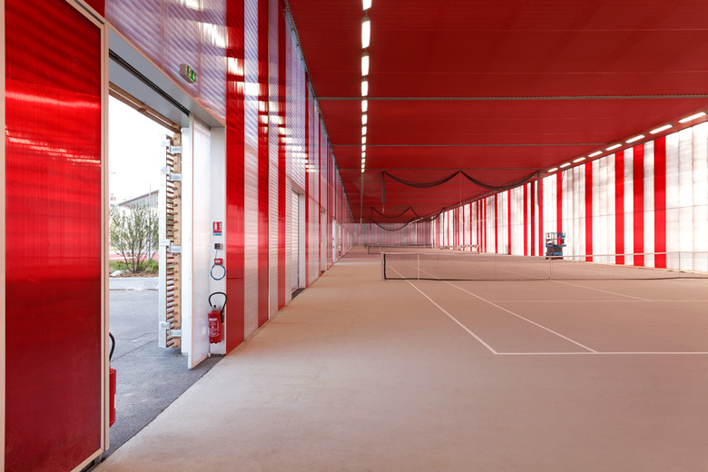 Sa transparence permet de conserver les vues sur le canal de l’Ourcq et sa forme en pointes de diamant apporte un jeu de lumières la nuit avec les phrases des voitures. Les façades du bâtiment des tennis sont réalisées en une double peau en panneaux alvéolaires en polycarbonate à l’intérieur.