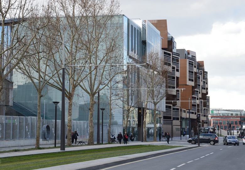 Les lignes rouge et grise que forment la façade sur le périphérique rappellent les touches d’un piano, clin d’œil à la cité de la musique qui lui fait face.