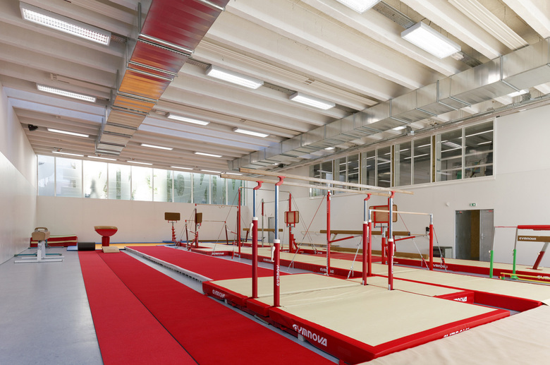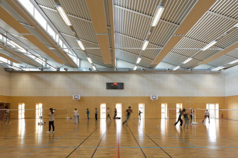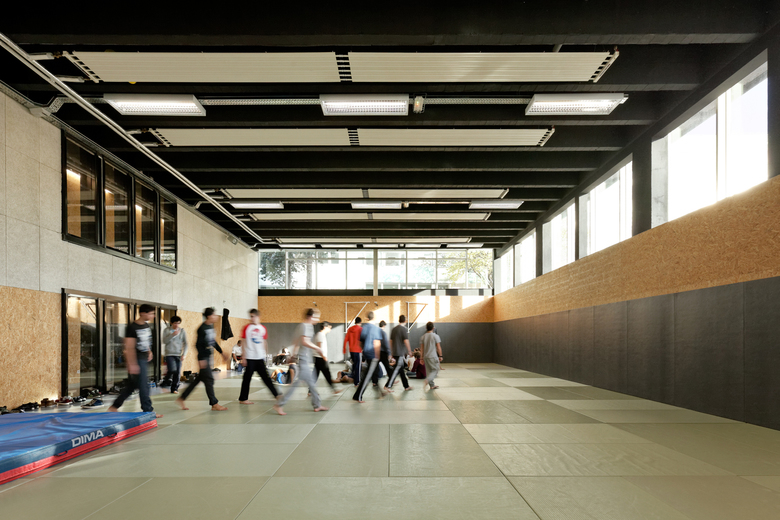 All the halls are designed for competition activities. The gym and the box training hall on level -1 are naturally lit by a continuous range of windows oriented to the pathway. A zenithal window tape on the maintenance free green roof provides additional natural light to the 2 halls. The martial arts training hall is situated towards the courtyard of the high-school and equally equipped with large windows in the upper part. On the first floor are situated the judo hall with 2 tatamis and a fully equipped fitness room combined with changing facilities, showers and some small offices dedicated to the administrative staff of the sport clubs. The second floor is entirely occupied by the basketball hall. A floating oak sport parquet covers the floor. The storage for sport material is separated from the sport field by wooden wall bars. Natural balanced light is provided by sheds integrated in the roof. Covered with double glazed windows they allow the evacuation of hot air in summer and prevent the hall from overheating. On the last two ranges of sheds 10 solar panels are fixed supporting the heating and warm water production of the building. All interior walls of the sport halls received acoustic treatment and where necessary shock-treatment.