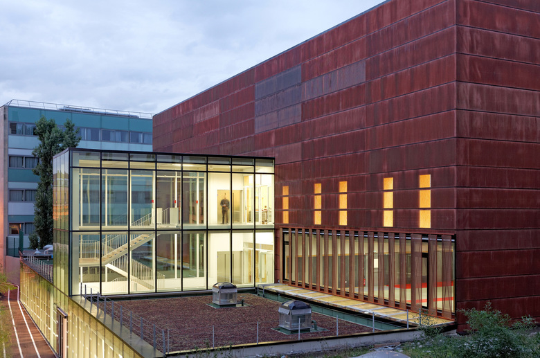 The solution consists in creating a real “showcase” for sportive activities by designing a glass base on topped by a copper cladded volume.