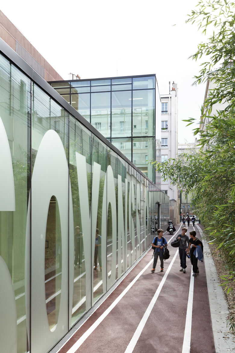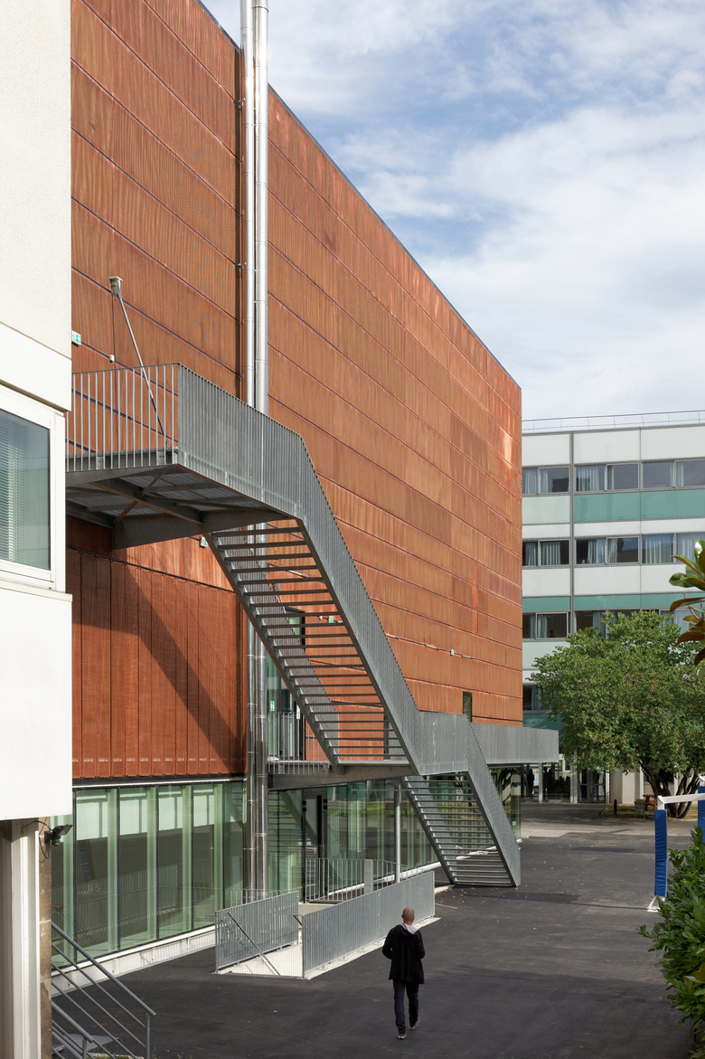 A solution had to be found in order to “announce” the equipment from the very extremity of the pathway where the entry is situated, as well as to highlight its functional diversity in the middle of the surrounding buildings. The centres visibility is strengthened through the design of the pathway leading to its entry. A red coating with white lines let one think of a running race track and invite to discover the glazed façade of the entrance telling the inhabitants of Vincennes “Let’s be sport”. The glazed ground floor base illuminates at night creating an effect of transparencies that make the copper volume seem to float on top.