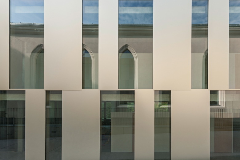 La tentative, au 19e siècle, d’ouvrir grand l’ancienne école équestre, se reflète dans le nouveau bâtiment scolaire. Elle est reprise et adaptée d’une façon actuelle contemporaine. Ce jeu de contrastes – des différentes technologies, modes de construction, matériaux et techniques énergétiques – s’exprime également par le reflet de l’ancien bâtiment sur la façade de la nouvelle école. Cet effet s’inverse dès qu’il fait nuit, lorsque le bâtiment scolaire éclaire l’ancien studio.