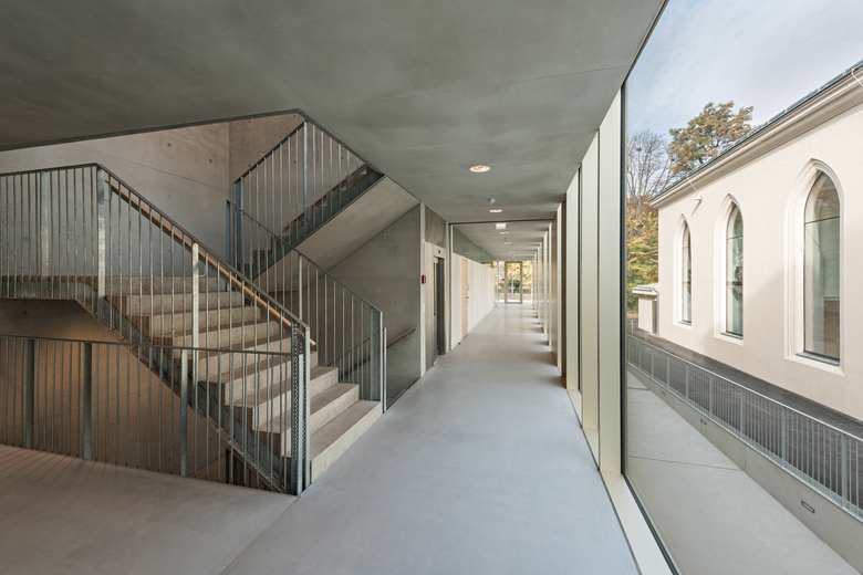 La nouvelle aile avec les classes est conçue comme un bâtiment de basse consommation thermique selon les règles de l’art. Les valeurs moyennes U des fenêtres (triple vitrage) s’élèvent à 0,7 W/m2 K, celles des murs extérieurs et du toit, à 0,2 W/m2K.