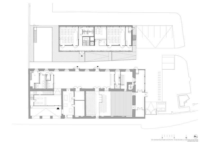 La fonction culturelle du „théâtre“, sa situation et son organisation particulières dans un bâtiment historique et l’identité du nouveau bâtiment scolaire sont au centre du projet.