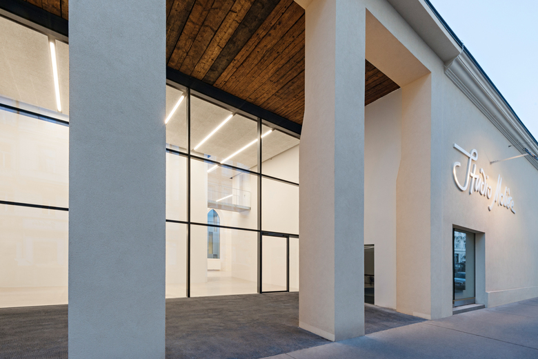 Les fonctions centrales telles que l’entrée, l’accueil et la librairie, sont situées côté Liechtensteinstrasse, à côté et sous la salle, et sont donc clairement orientées vers l’espace public. Le nouvel espace d’accueil est en retrait par rapport à l’alignement des bâtiments et « inséré » dans le volume du bâtiment, afin de permettre au visiteur une première orientation dans un espace de parvis couvert. C’est une aire de séjour, d’attente. En supprimant les deux plafonds existants, cet espace gagne une générosité qui annonce déjà au visiteur la fonction spécifique.