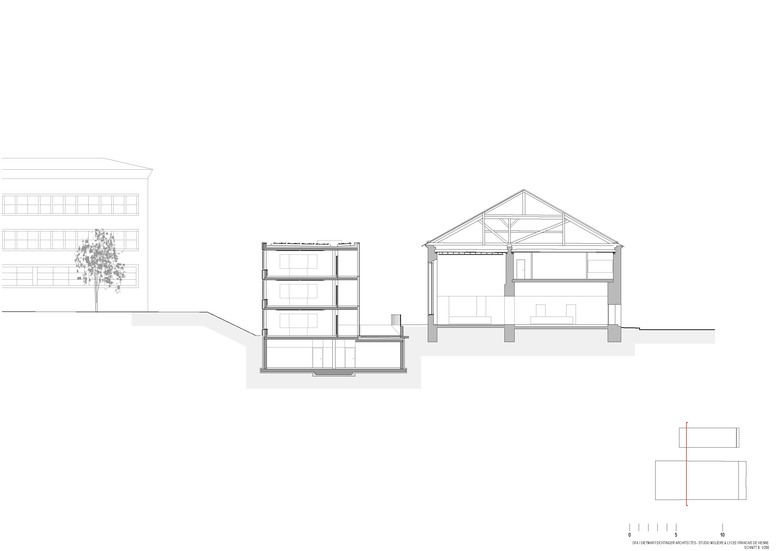 Respectant le bâtiment du Studio et sa façade, le nouveau bâtiment scolaire se trouve au sud-ouest, en retrait pour offrir un nouvel espace libre.