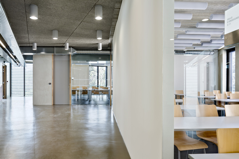 One of the essential characteristics of Aix-en-Provence campus that results from its difficult topography (a steeply sloping site) is the existence of small open spaces directly in front of the buildings. They all represent recreation spaces along the routes through the campus. Feichtinger takes up this urban pattern: he divides up the brief into three small blocks of different sizes and configurations in this way creating a virtual rectangle whose centre is an empty area. The placing of this ensemble, which is set back from the road, avoids direct confrontation with the context. You enter the campus by crossing this space. The layout of the buildings creates two directions, two streets that lead the students either to the main buildings on the higher ground of the campus, or to the neighbouring library. This quiet place, with proportions comparable to a large internal courtyard, forms a calm entrance to the campus both with regard to the external context and to the steep routes that the students must follow to reach the individual buildings that step up the slopes.