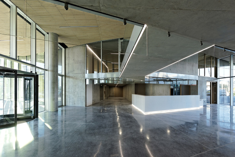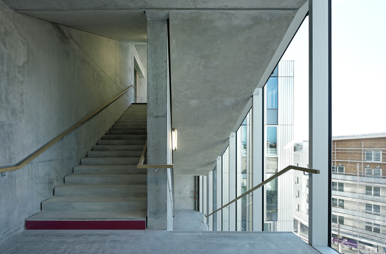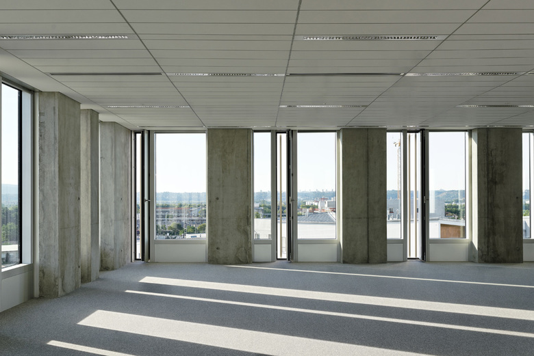 L’entrée du bâtiment se fait par un hall traversant accessible depuis les deux rues piétonnes. Le hall profite d’une lumière naturelle. Il s’installe en continuité de l’espace urbain en instaurant une notion de séquence d’entrée pour les salariés avant de passer le contrôle d’accès. Les niveaux supérieurs accueillent les espaces des bureaux. Répartis en cinq lots d’environ 350 m² par étages, ils sont desservis par deux colonnes de circulations verticales. Situées en périphérie, elles libèrent un maximum de surface pour les bureaux tout en permettant leur totale indépendance. Chaque noyau possède un escalier à double-volée et bénéficie d’un éclairage naturel incitant à les emprunter.