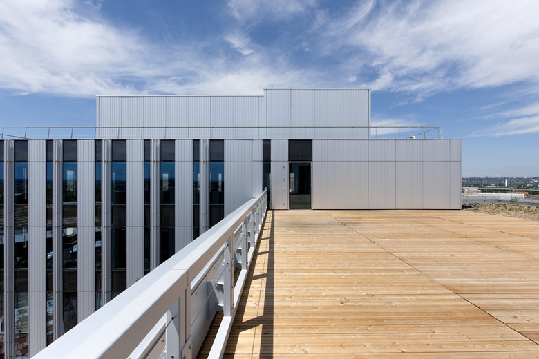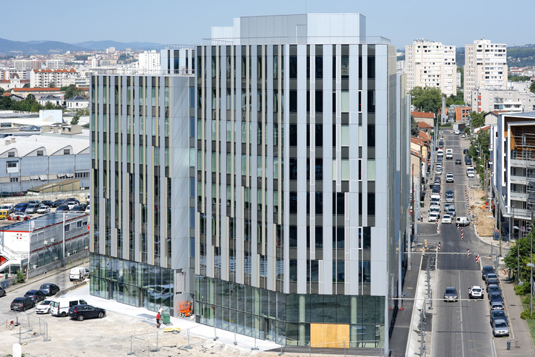 Le bâtiment constitue un élément fort et indissociable du carré de Soie. Il perpétue l’échelle urbaine du quartier en pleine extension via un front bâti sur rue tout en étant l’un des premiers éléments visibles et identifiables depuis l’esplanade. Le programme de bureaux participe à la configuration de la ville suivant les principes de l’opération : commerces et restauration en rez-de-chaussée, hall traversant et lumineux, multiplicité des accès. De part, sa transparence et ses fonctions, le RDC forme un tout avec l’espace public qui l’entoure. il accueille des commerces ainsi que des espaces de restauration qui participent à l’animation de son environnement proche. Sa hauteur de 5,50 m en façade lui confère un statut de socle.