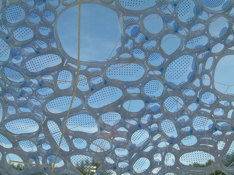 わたしたちは、植物のもつこの仕組みを建築的に翻案するための装置として、球形のPVセルによる透光型ソーラーパネルを提案しました。ひとつひとつのセルが球形をしていることで、あらゆる角度からの光をレシーブすることが可能になり、太陽光発電の有効性が高まるものと期待しています。(建築的葉緑体)