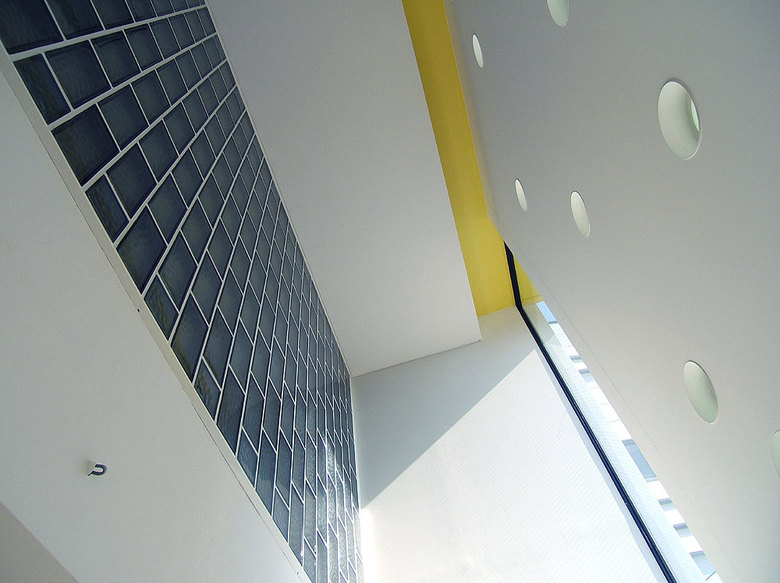 新しい駅前交番は、新鮮さを感じさせると同時に街の記憶を継承して行くことも重要であると考え、取り壊される前の旧駅舎で用いられていた市民になじみの深いガラスブロックを、入口上部の光壁として再利用しました。