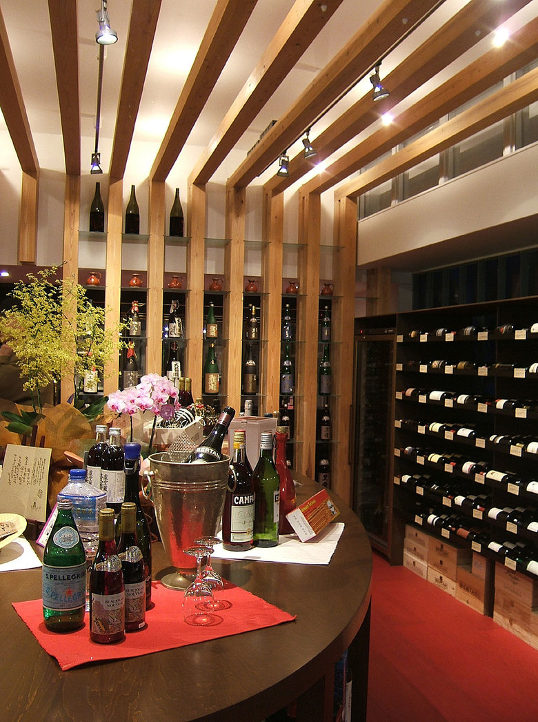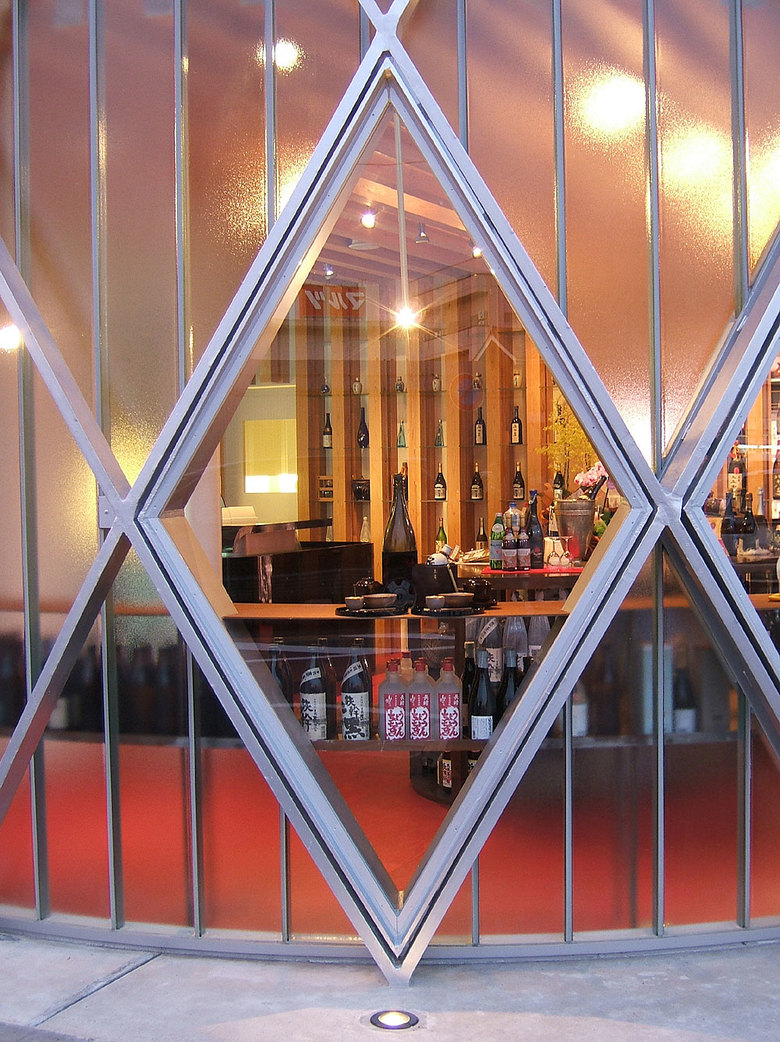 1階は日本酒をメインとした店舗で、建て替え前に一度改装設計を担当しました(田中屋酒店)。店舗のインテリアは、その時に用いた杉材を慎重に解体・保存し、そのまま再利用しています。杉のフレーム、漆黒の試飲カウンター、日本的な赤で塗られた床のフローリングが主なデザイン要素です。棚板は赤茶色に錆びた鋼板を用いてつくりました。