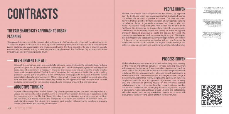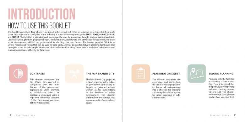 This booklet consists of four chapters designed to be considered either in sequence or independently of each other. Each objective is closely tied to the following sustainable development goals: SDG5, SDG9, SDG10, SDG11, and SDG17. The booklet is also designed to engage the user by provoking thought and generating feedback. Urban designers, planners, project managers, design students, researchers, and enthusiasts for just and sustainable urban development will find this guide useful for charting their own futures. The booklet provides QR links to several reports and videos that can be used for case study analyses on gender inclusive planning techniques and strategies. It also includes ample ‘whitespace’ that can be used for taking notes, critical analysis of points made and making suggestions, all handy for future use.
