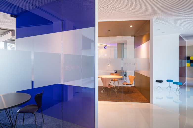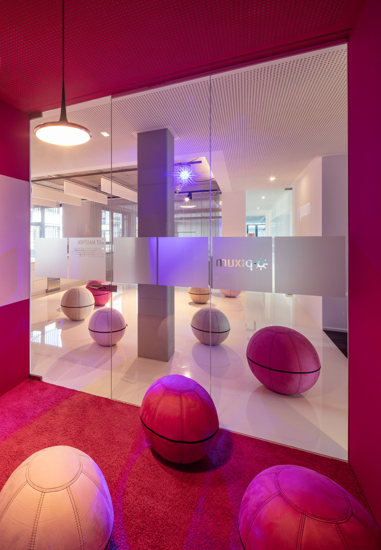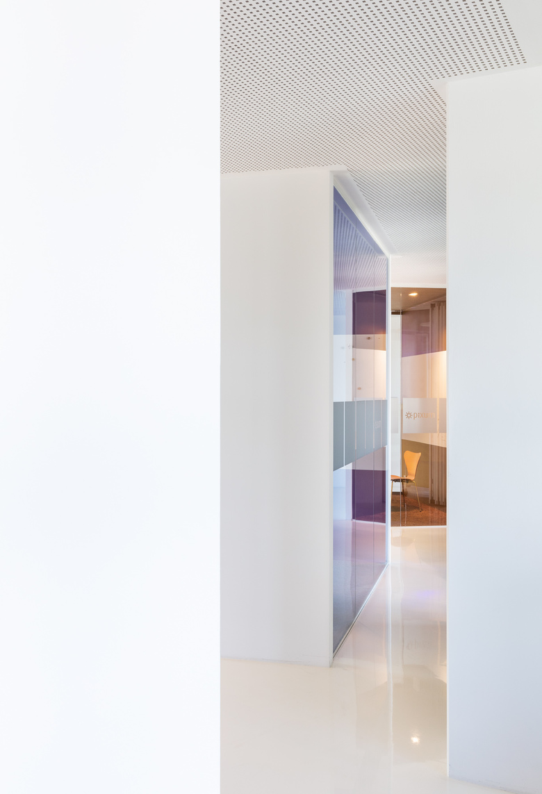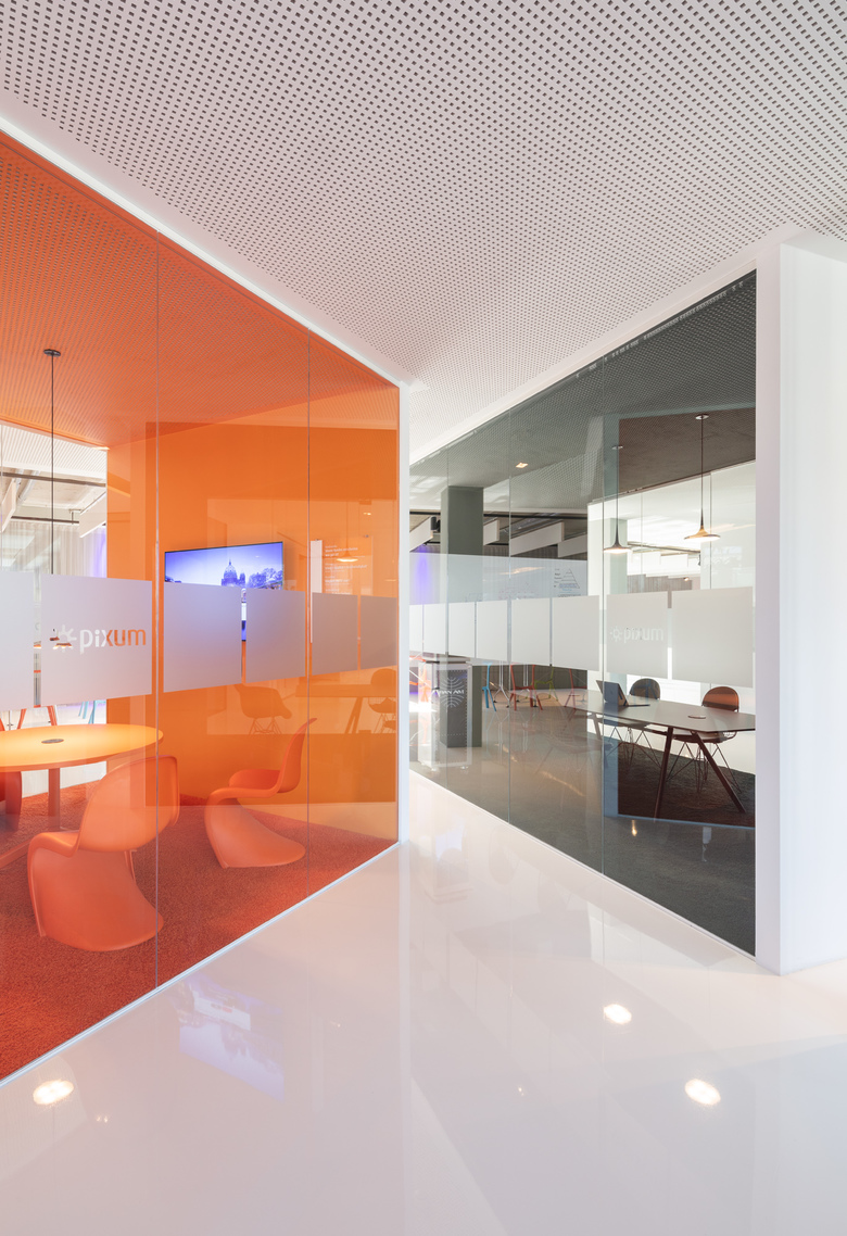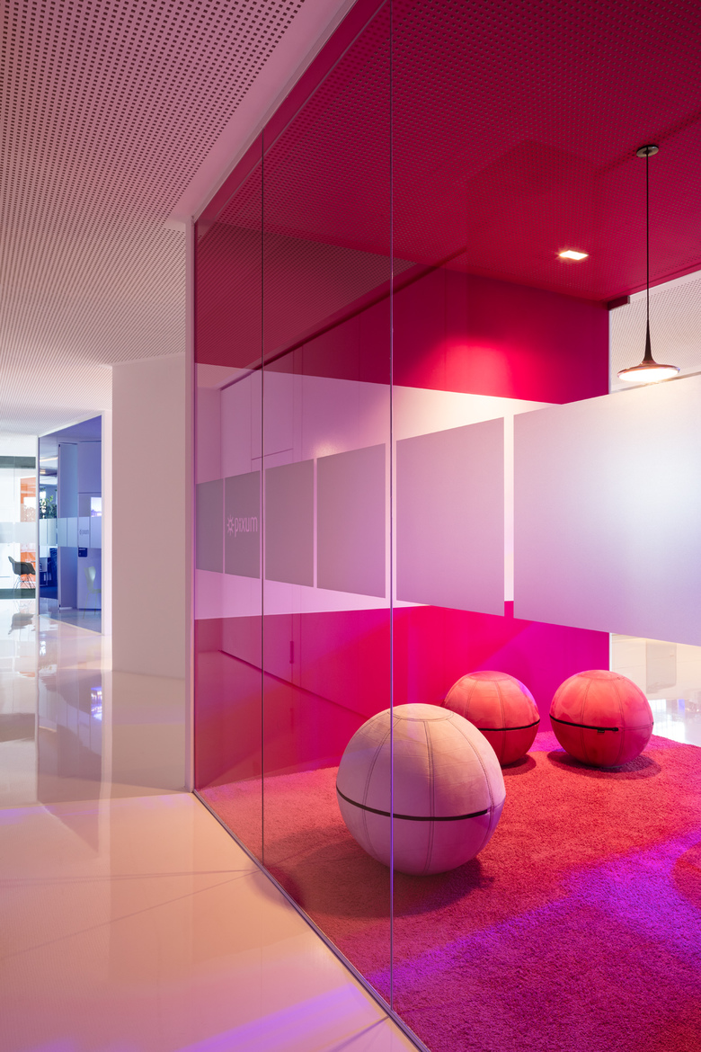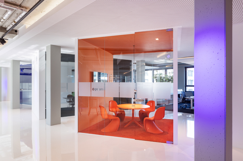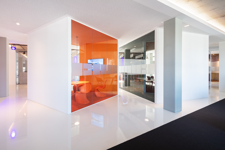 Für den U-förmigen Grundriss wird eine offene, moderne, den Erfordernissen eines international operierenden IT-Unternehmens entsprechende Büro- und Arbeitswelt vorgeschlagen. Der vorgefundene Rohbaucharakter des Gebäude- bestands wird teilweise beibehalten, durch das Einstellen von „Raumskulpturen“ bilden sich die einzelnen Funktionseinheiten aus Büroarbeitsplätzen, Kommunikationszonen, Cafeteria und Meetingräumen ab. Der weiß-glänzende Epoxidharzboden verbindet sich über die Wandscheiben der Meetingräume und WC-Kerne mit der Abhangdecke. Eine umlaufende Lichtfuge setzt diese von der rohbelassenen Sichtbetondecke ab und verstärkt so den Charakter der in den Rohbau eingestellten Raumskulptur. Leitungsführungen und Verkabelungen werden im Rohdeckenbereich sichtbar belassen, verschwinden dann plötzlich in der Lichtfuge der Abhangdecke. Ein spannungsvolles Wechselspiel aus Alt und Neu entsteht.