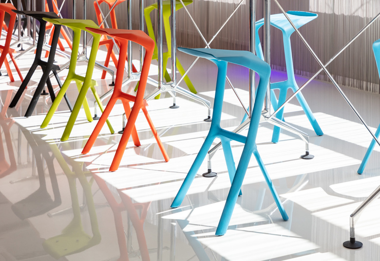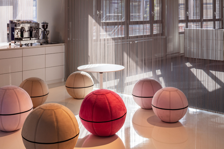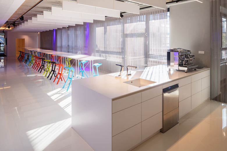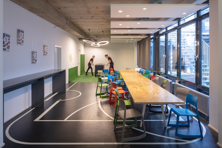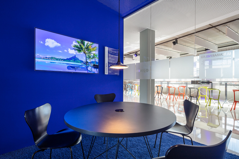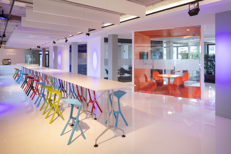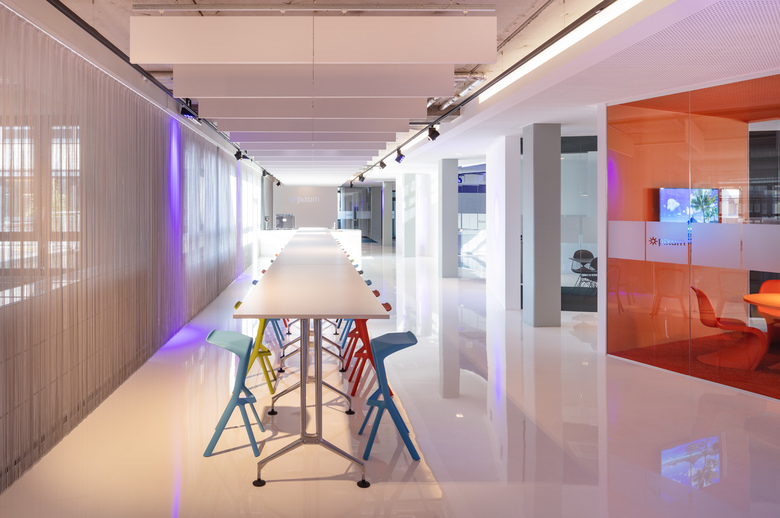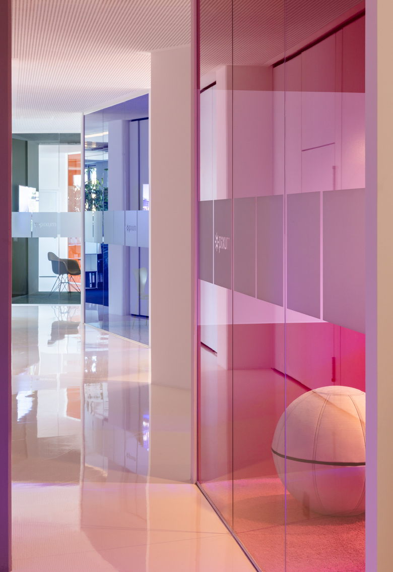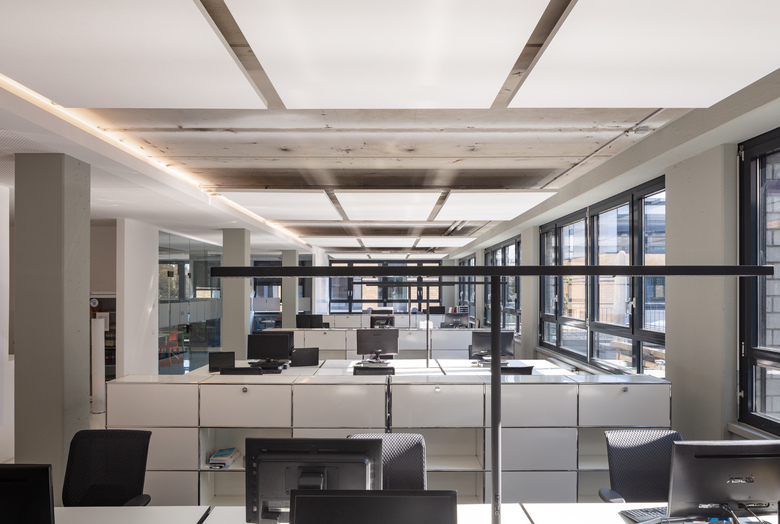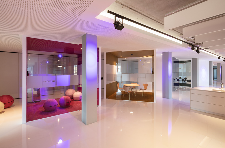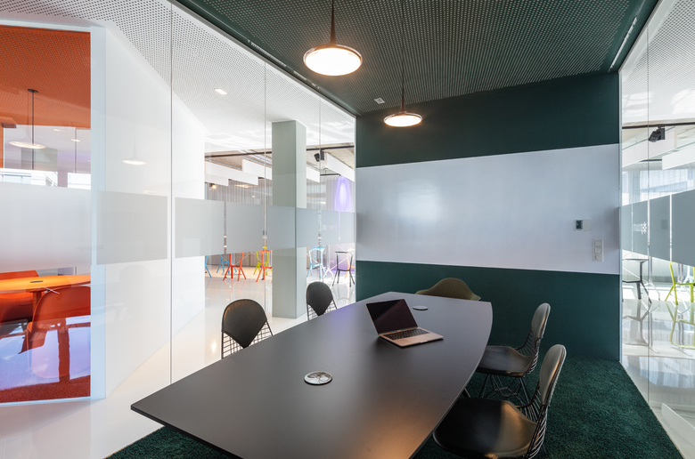 Für den U-förmigen Grundriss wird eine offene, moderne, den Erfordernissen eines international operierenden IT-Unternehmens entsprechende Büro- und Arbeitswelt vorgeschlagen. Der vorgefundene Rohbaucharakter des Gebäude- bestands wird teilweise beibehalten, durch das Einstellen von „Raumskulpturen“ bilden sich die einzelnen Funktionseinheiten aus Büroarbeitsplätzen, Kommunikationszonen, Cafeteria und Meetingräumen ab. Der weiß-glänzende Epoxidharzboden verbindet sich über die Wandscheiben der Meetingräume und WC-Kerne mit der Abhangdecke. Eine umlaufende Lichtfuge setzt diese von der rohbelassenen Sichtbetondecke ab und verstärkt so den Charakter der in den Rohbau eingestellten Raumskulptur. Leitungsführungen und Verkabelungen werden im Rohdeckenbereich sichtbar belassen, verschwinden dann plötzlich in der Lichtfuge der Abhangdecke. Ein spannungsvolles Wechselspiel aus Alt und Neu entsteht.