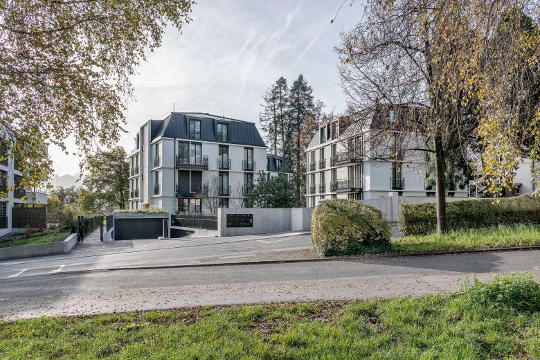 An bevorzugter Lage im beliebten Stadtquartier Dreilinden nehmen die drei neuen Stadtvillen einen ganz speziellen Platz ein. Ihre schlichte und elegante äussere Erscheinung leitet sich von Gestaltungsmerkmalen klassischer Villenbauten ab, interpretiert diese aber auch zeitgenössisch und modern. Auf eine gute Integration der neuen Baukörper ins wertvolle Quartierbild wurde grossen Wert gelegt. So weisen die Häuser beispielsweise erhöhte Sockelgeschosse mit Hochparterre sowie villentypische Mansardendächer auf. Jedes einzelne Geschoss jedes Hauses bietet eine einzigartige, exklusive Wohnsituation mit unterschiedlichen Sichtbezügen in die Stadt, zum See oder zum Konservatorium. Zwischen den drei Stadtvillen sorgt ein üppig angelegter Schaugarten mit Magnolienbäumen für eine stimmungsvolle Atmosphäre.