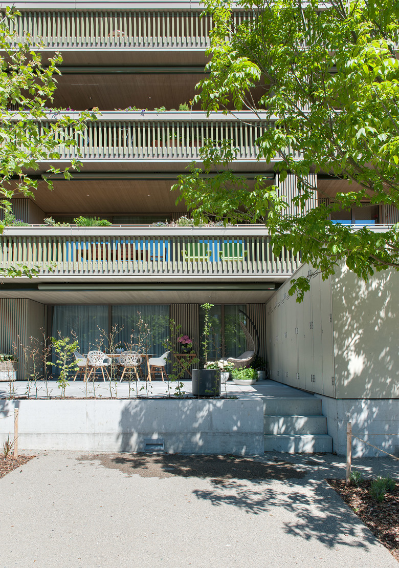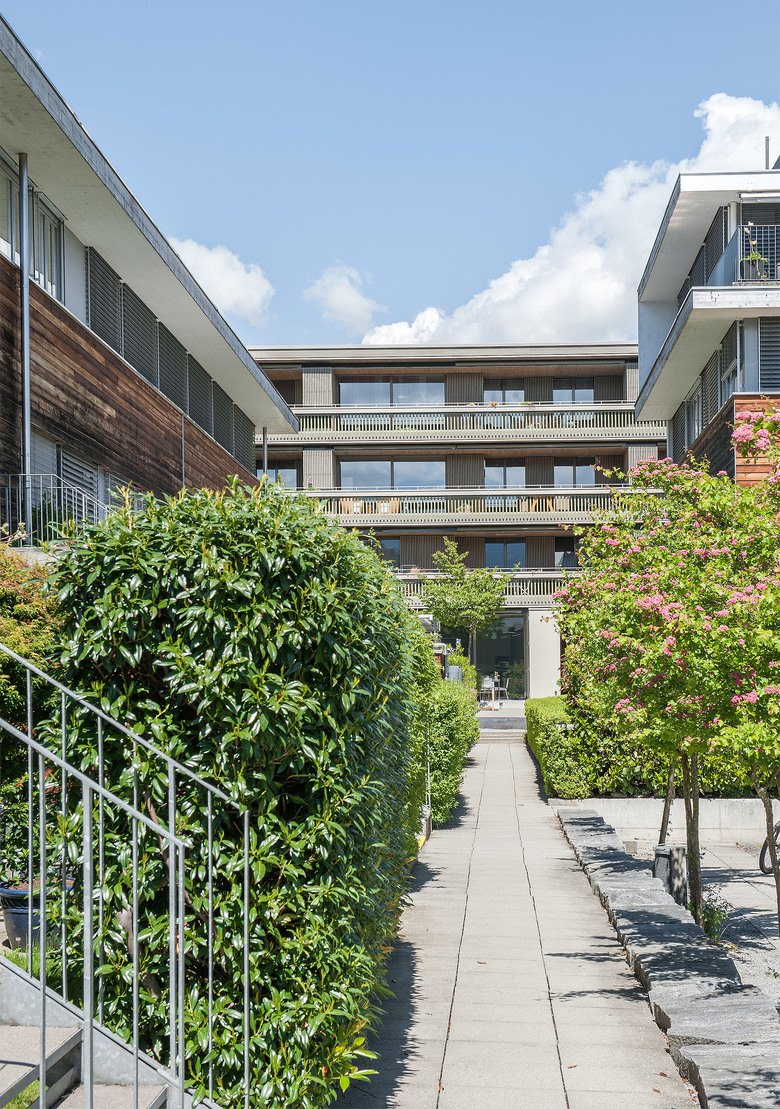 Zwei präzise gesetzte Bauvolumen komplettieren die Gartensiedlung Erlen. Die neuen Wohngebäude orientieren sich in ihrem Massstab an den bestehenden Gebäuden der Gartensiedlung Erlen. Die Aussenräume der Siedlung werden durch die neuen Bauten gefasst. Im Inneren der Siedlung entstehen zwei Hofräume: eine Promenade als siedlungs-öffentlicher Erschliessungsraum und ein lichter Hain von Bäumen und Sträuchern als nicht aktiv genutzter Siedlungsgarten. Der neue Zugang im Westen nimmt Besucher und Bewohner in Empfang und führt sie in die innere Welt der Gärten, Wege und Plätze, welche die gesamte Anlage durchzieht und mit dem bestehenden Erlenquartier im Osten verknüpft. Das verwobene Wegsystem, die locker verteilten Baumgruppen und das üppige Grün gliedern den Freiraum der Siedlung. Der motorisierte Individualverkehr der Wohnanlage wird an der neu entstehenden Quartierstrasse im Westen direkt abgenommen und unterirdisch zu den Wohnhäusern geführt, wodurch eine verkehrsfreie Begegnungszone entsteht. Die offene Siedlung mit grossen, zusammenhängenden Freiräumen bietet ein attraktives Wohnungsangebot für Menschen, welche den Wunsch nach zeitgemässem Wohnen in einer urbanen aber doch ländlichen Umgebung suchen. Verschiedenartige Wohnungstypen reihen sich in unterschiedlichster Art aneinander. Geschosswohnungen, überhohe Wohnungen, Duplex-Wohnungen, reihenhausähnliche Maisonetten, Dachwohnungen mit Oblichtern etc. verbinden sich zu einem dichten, typologischen Gefüge.