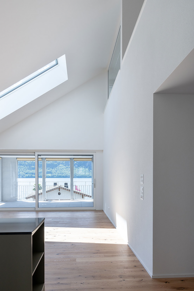 Zur Struktur der Wohnungen: Die gemeinschafltichen Räume richten sich gegen das Berg- und Seepanorama im Süden. Die Zimmer sind überwiegend im hinteren Bereich des Gebäudes angelegt und öffnen sich zur vielfältigen Umgebung.