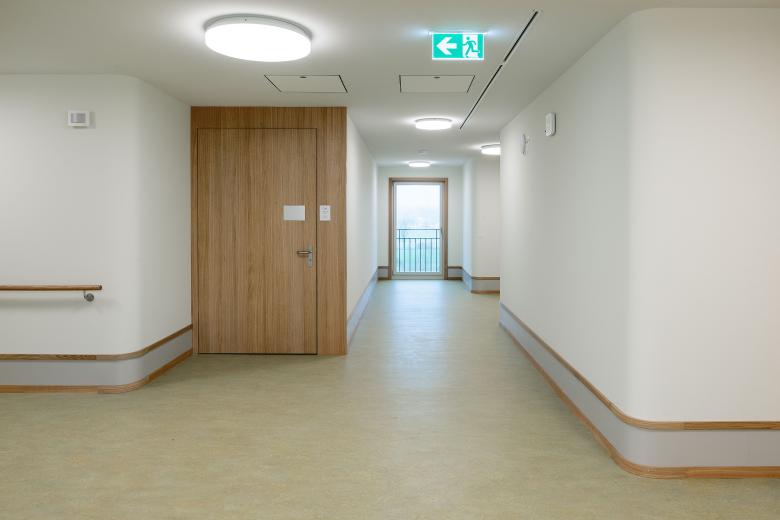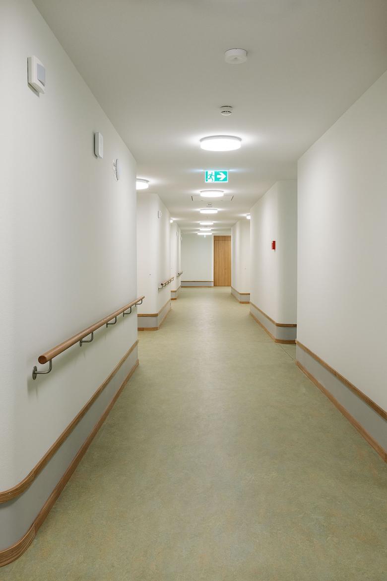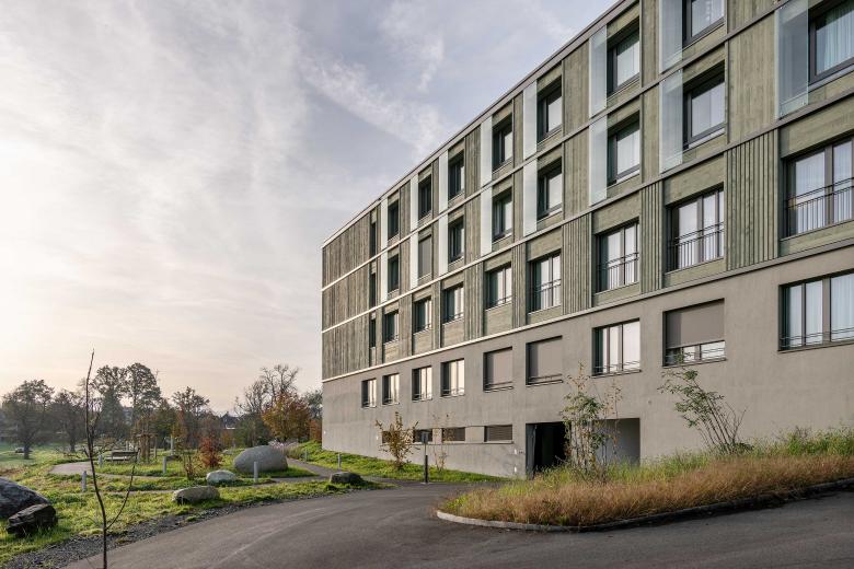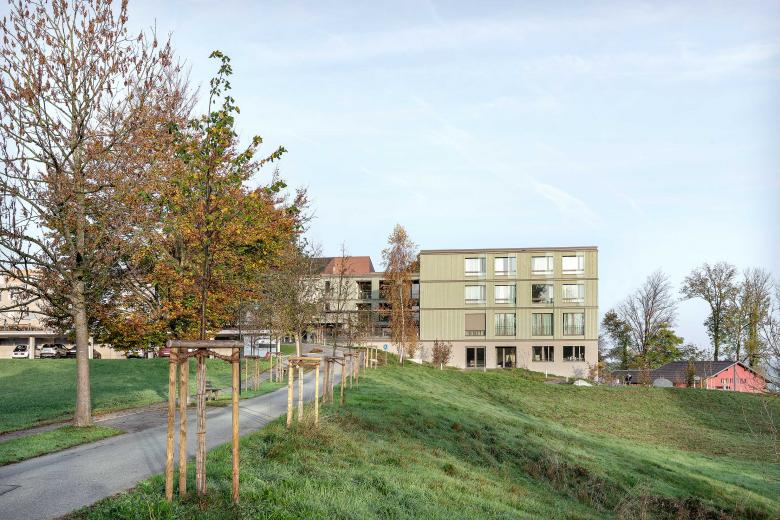 Der Ersatzneubau orientiert sich klar an der Stellung des ehemaligen Bürgerheims. So bleibt sowohl die ortsbauliche Präsenz des prägnanten Gebäudekörpers wie auch die Auszeichnung des Ortes in der Fernwirkung bestmöglich erhalten. Der Neubau legt sich winkelförmig um den Sockel des Altbaus und schliesst präzise an die Fassadenfluchten des bestehenden Westflügels an. In seiner Wahrnehmung zeigt sich der Baukörper als klares, stattliches, in den Hang gesetztes Volumen. Auch bei der Gliederung und Gestaltung der Fassaden zeigt sich beim Neubau eine respektvolle Auseinandersetzung mit seinem «Vorgänger». Diese erfolgt über eine zeitgemässe Neuinterpretation der Regelhaftigkeit klassischer Gestaltungselemente des alten Bürgerheims.