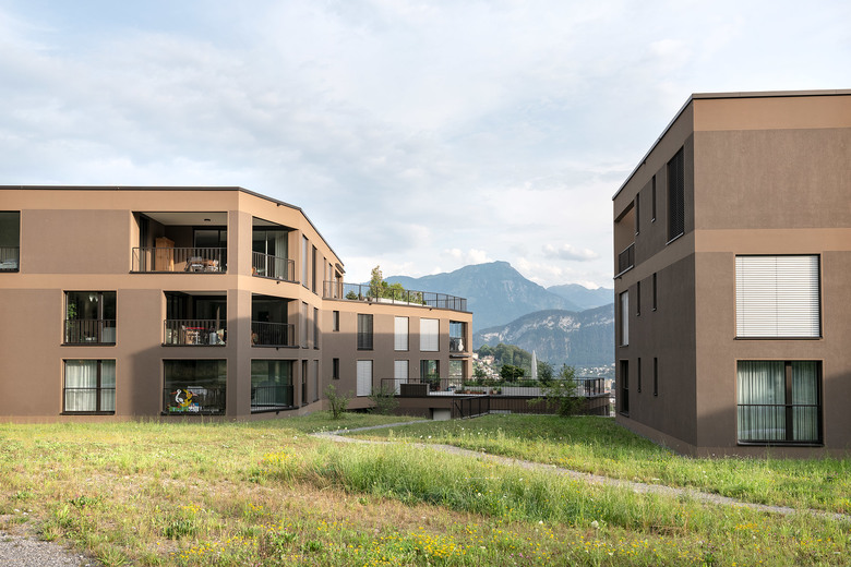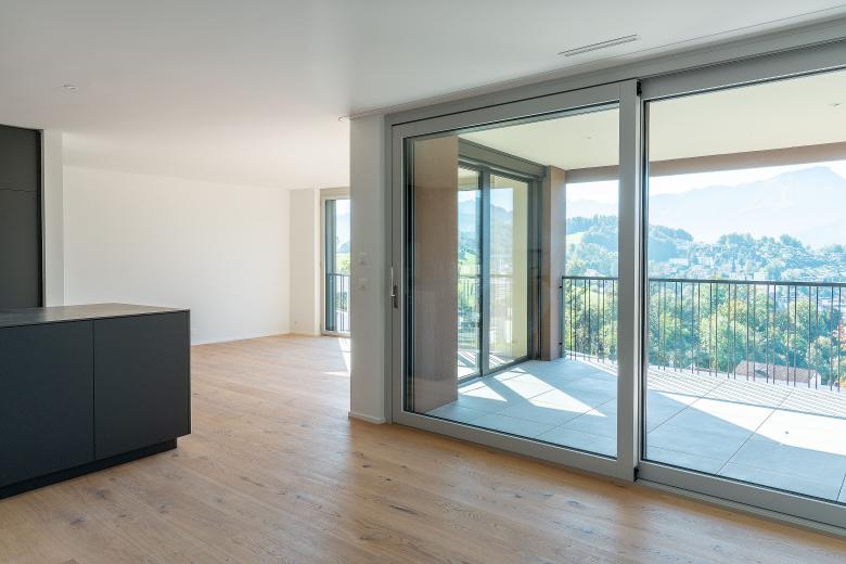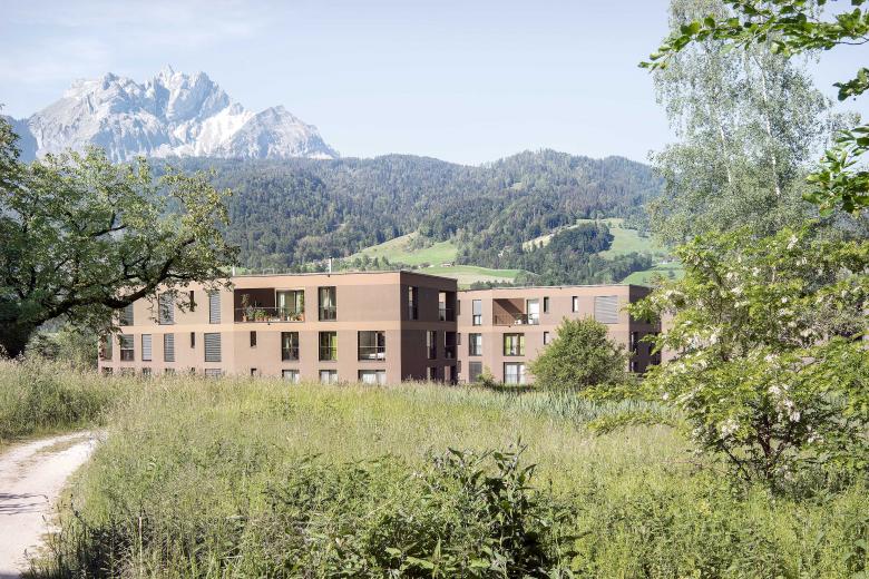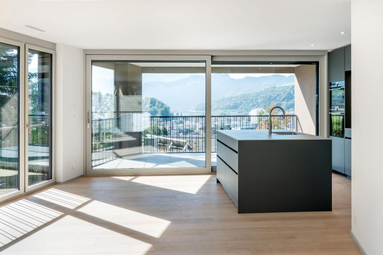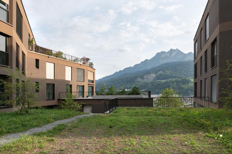 Die neuen Bauten sollten mit grösstmöglichem Respekt und unter Wahrung des öffentlichen Erholungs-, Begegnungs- und Aussichtsraumes in den sensiblen Naturraum Stirnrüti integriert werden. Durch eine dichtere Anordnung der Volumen entlang der Hangkante kann die Hügelkuppe vollständig von Bauten freigehalten werden. Der spürbare Gegensatz von verdichtetem Siedlungsbereich und weitläufigem, öffentlichem Naturraum verleiht dem Eingriff eine Klarheit und räumliche Spannung. Dadurch gewinnt einerseits die Siedlung an Identität mit klarer Adressbildung, andererseits bleibt die schützenswerte Naturlandschaft intakt und wird als Aufenthaltsraum im Übergang von Siedlung zum Bireggwald räumlich gestärkt. Die Sichtbezüge auf Landschaft und Pilatus bleiben erhalten. Die bauliche Intervention in die Landschaft ist klar und eindeutig, mit wenigen Bauten und effizientem, einfach in die Topografie gelegtem Untergeschoss kann die Wirtschaftlichkeit gesteigert werden. Als gegenüber zum Rande des Bireggwaldes definiert die neue Gesamtvolumetrie städtebaulich einen feingliederigen aber klaren Abschluss des Siedlungsgebietes. Die einzelnen Gebäudevolumen scheinen spielerisch geformt, sind aber präzise aufgrund der An- und Aussicht entwickelt. Die Formen schmiegen sich um die Hangkante, verschmelzen mit ihr und muten organisch an, direkt aus der Nachbarschaft des angrenzenden Waldes gewachsen. Durch die Höhenrückstaffelungen im ersten Ober- bzw. Attikageschoss und dem mehrfachen Knicken der Fassaden ordnen sich die Volumen, trotz beträchtlicher Ausmasse zurückhaltend in die Massstäblichkeit des Ortes ein. Die entstehenden Dachflächen bilden Terrassen auf unterschiedlichen Niveaus.