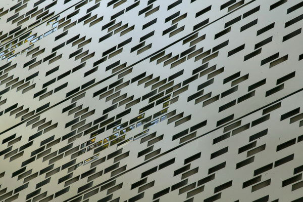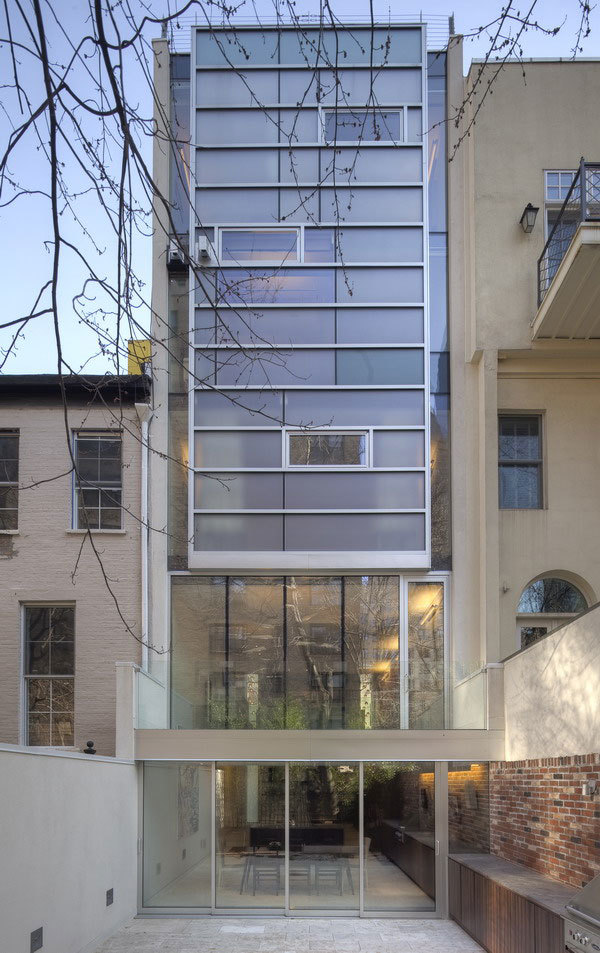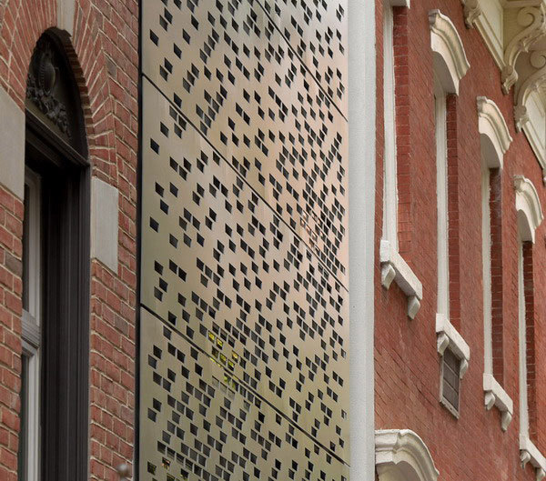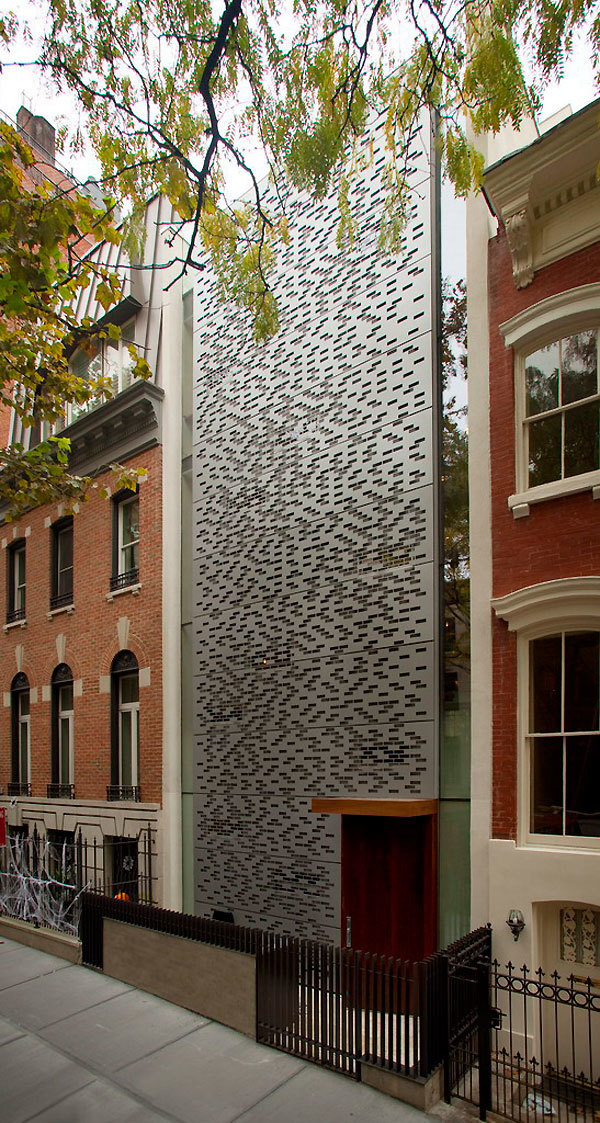 The front façade engages the street with a custom water-cut aluminum rain screen, with brick-shaped openings relating to the solid bricks of its neighbors. During the day, it appears as a flat, patterned mass, marked off from the adjacent houses by the tall glass slots on either side. The horizontal joints of the aluminum panels break up the vertical surface as a reference to the rhythm of the window spacing of the row houses. At dusk, this impression wanes as the glow from the horizontal slit windows and the vertical glass slots animates the street façade. The aluminum appears more as a screen than a mass, and invites the eye toward, but not into, the house.
