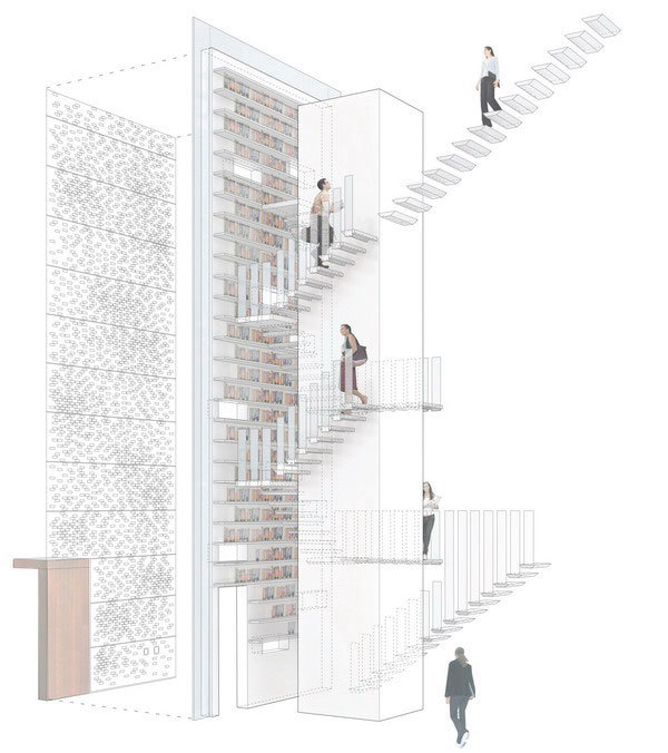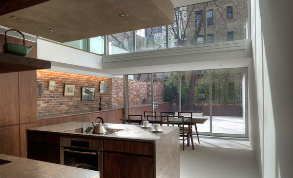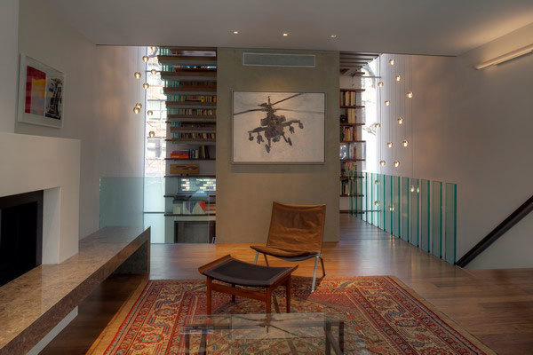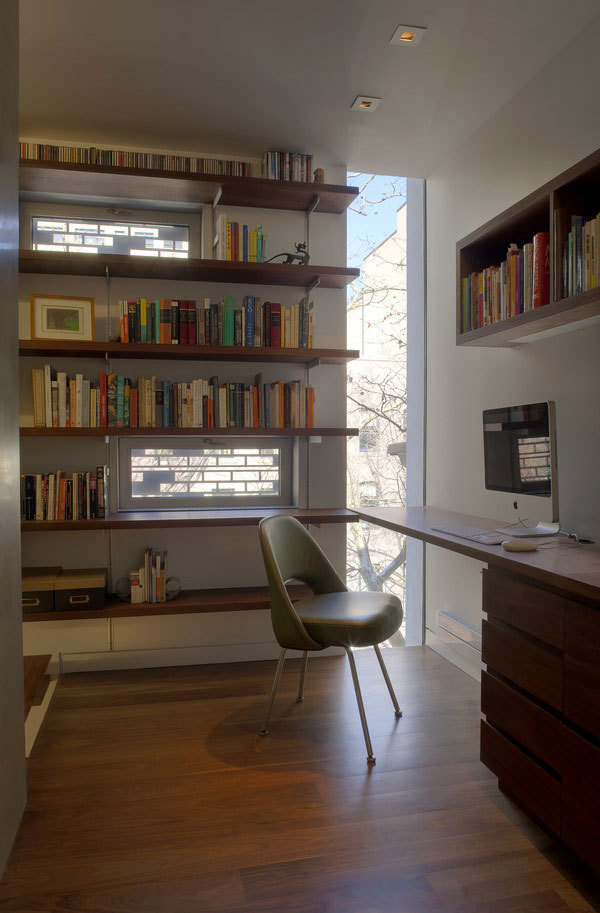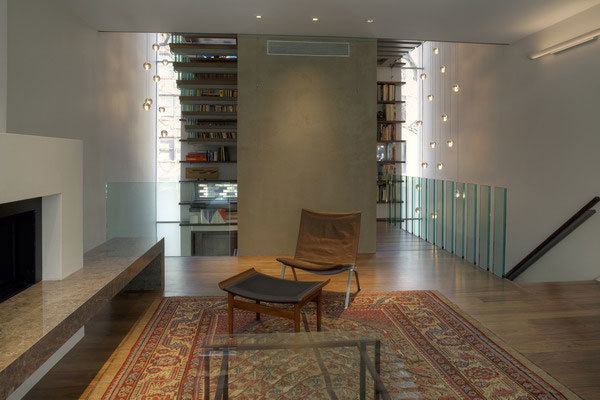 By radically reconfiguring the organization and façade of the building, open loft living finds privacy from the street behind a four-storey vertical library – in contrast to the standard New York City row house with parlor room windows right on the street, usually curtained or shuttered from the eyes of passersby.