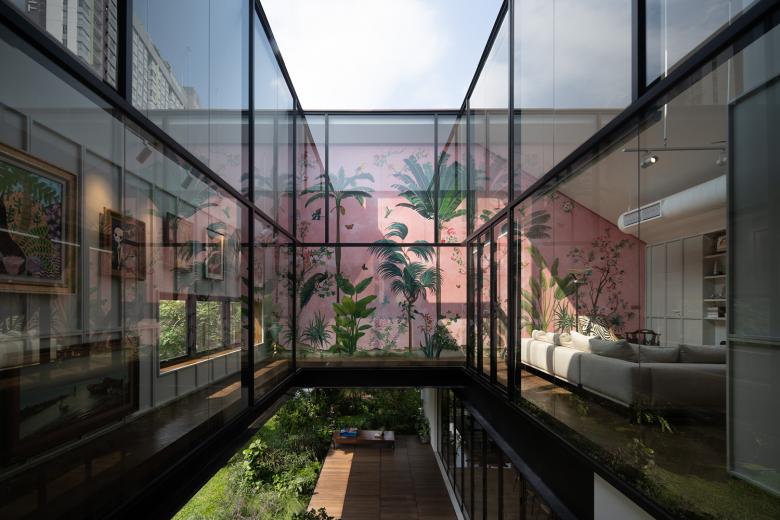 Die Grundstruktur des Wohnhauses besteht aus einer Galerie mit sechs Stützen, deren Fachwerkkonstruktion aus Stahl über dem Erdgeschoss mit der offenen Terrasse und der Grünanlage schwebt. Die hohen Decken und die raumhohen Verglasungen verleihen dem Wohnhaus einen offenen, luftigen Charakter. Vom natürlichen Tageslicht durchflutet, schaffen die verschiedenen Öffnungen Blickbeziehungen und Verbindungen zwischen den Bereichen innerhalb der Wohnflächen. Das Arrangement der Räume erlaubt eine neue Ausstellung der Kunst, die nun von allen Ecken des Hauses betrachtet werden kann.